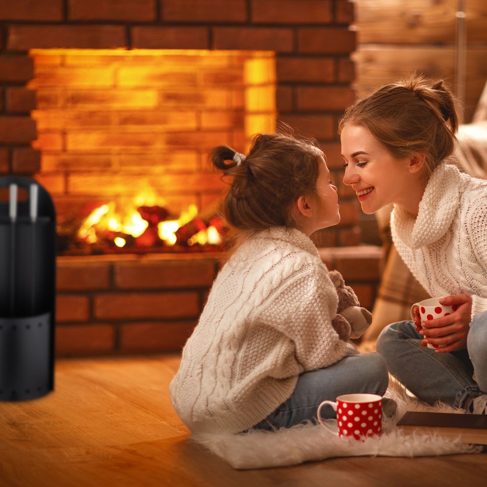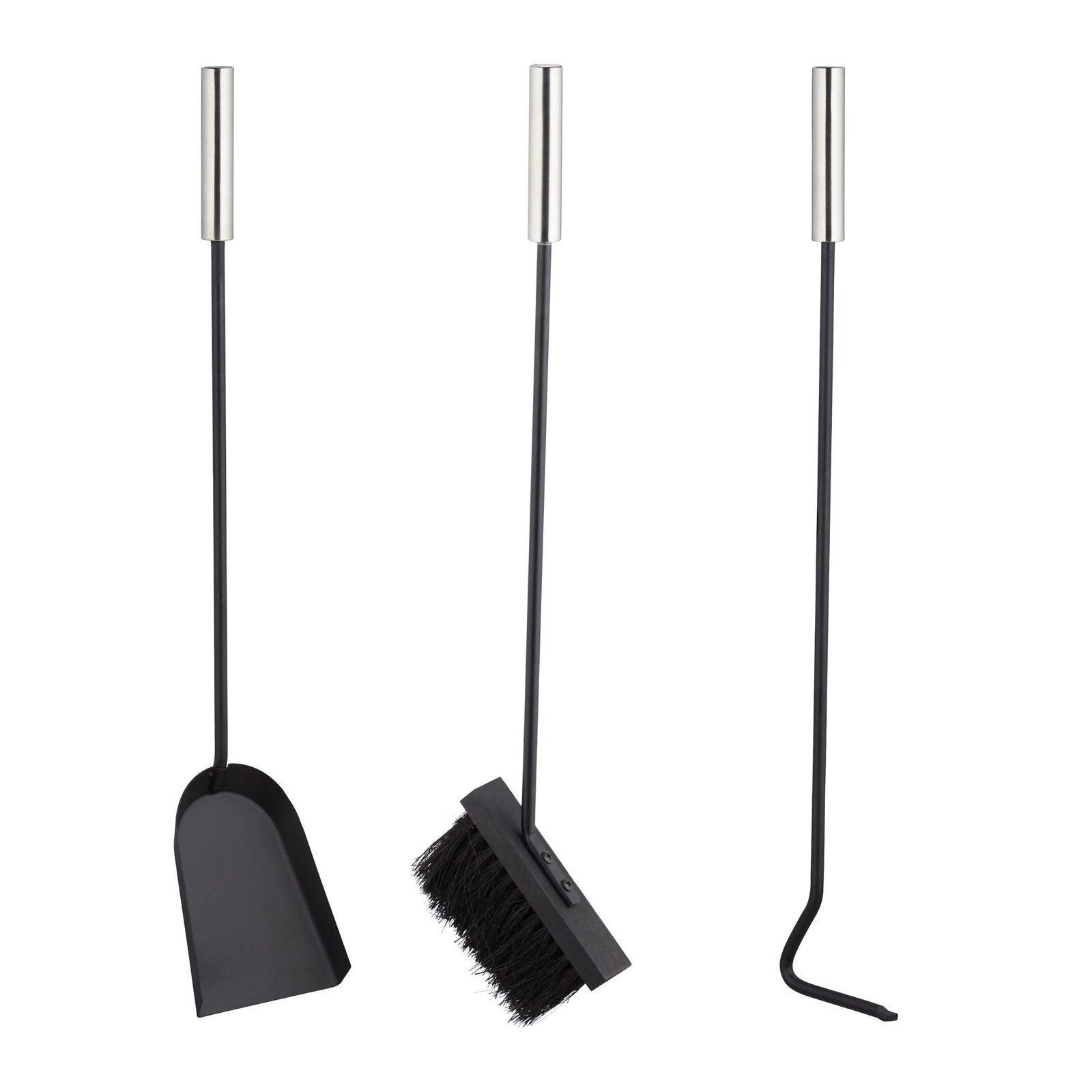 Включените стоманени инструменти – кочер, метла и лопатка – са устойчиви на топлина и достатъчно дълги за безопасна работа. Стойката позволява компактно съхранение и поддържа инструментите подредени. Подходящ за камини и печки на дърва.