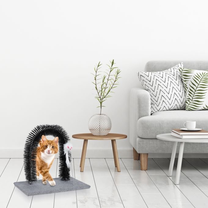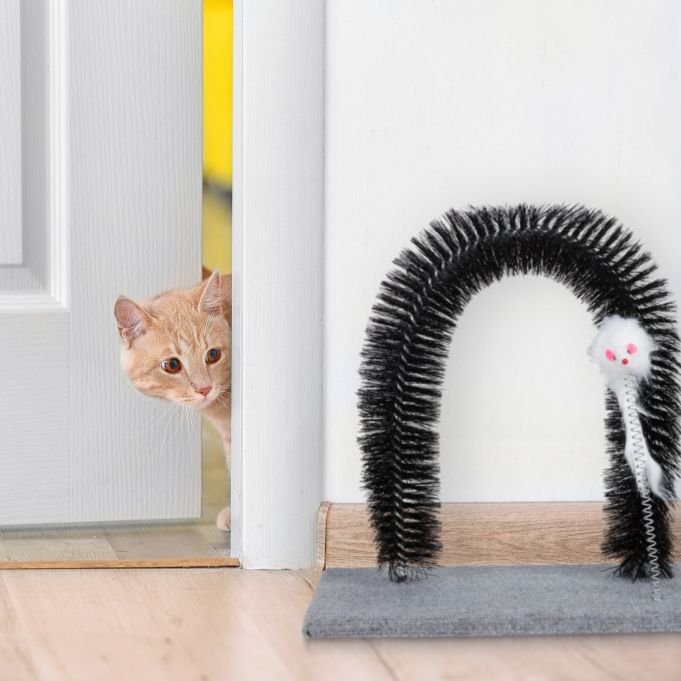 Арката за четкане на котки е удобен аксесоар за поддържане на козината. При преминаване през четките, мъртвите и заплетени косми се отделят и остават по арката, което намалява космите в дома.