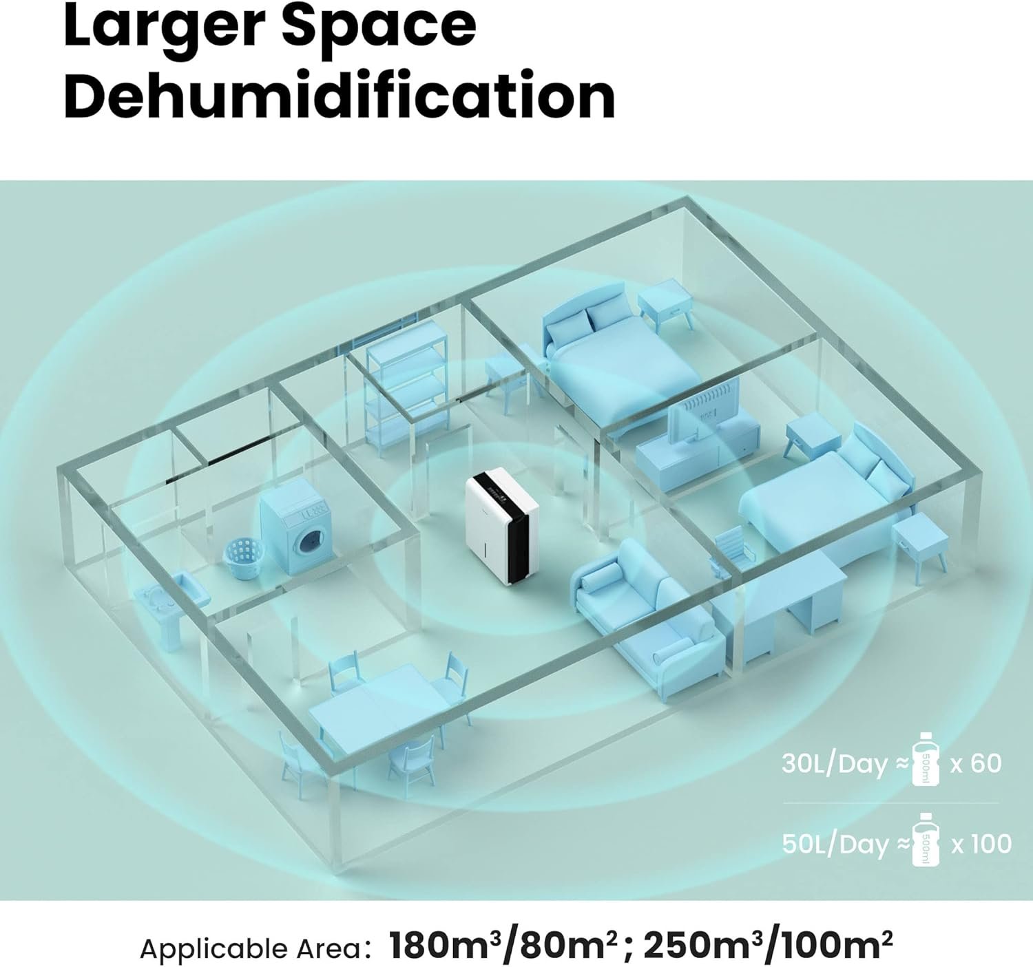 Уредът работи тихо и има интелигентен режим на осушаване, 24-часов таймер и резервоар за вода 3 литра. Може да се премества лесно благодарение на вградените дръжки и колела. Осушителят използва екологичен хладилен агент R290 и консумира 440 W.