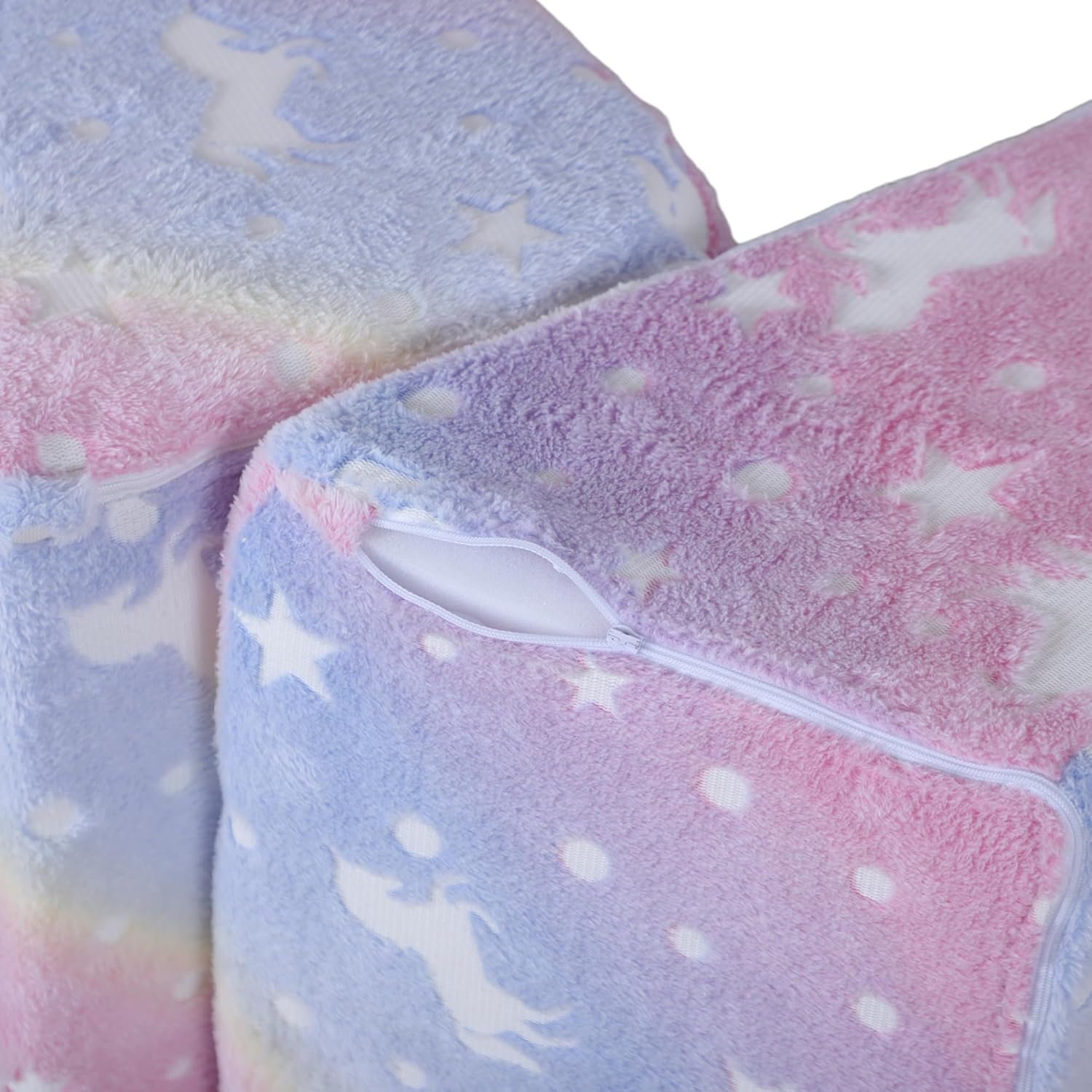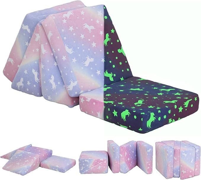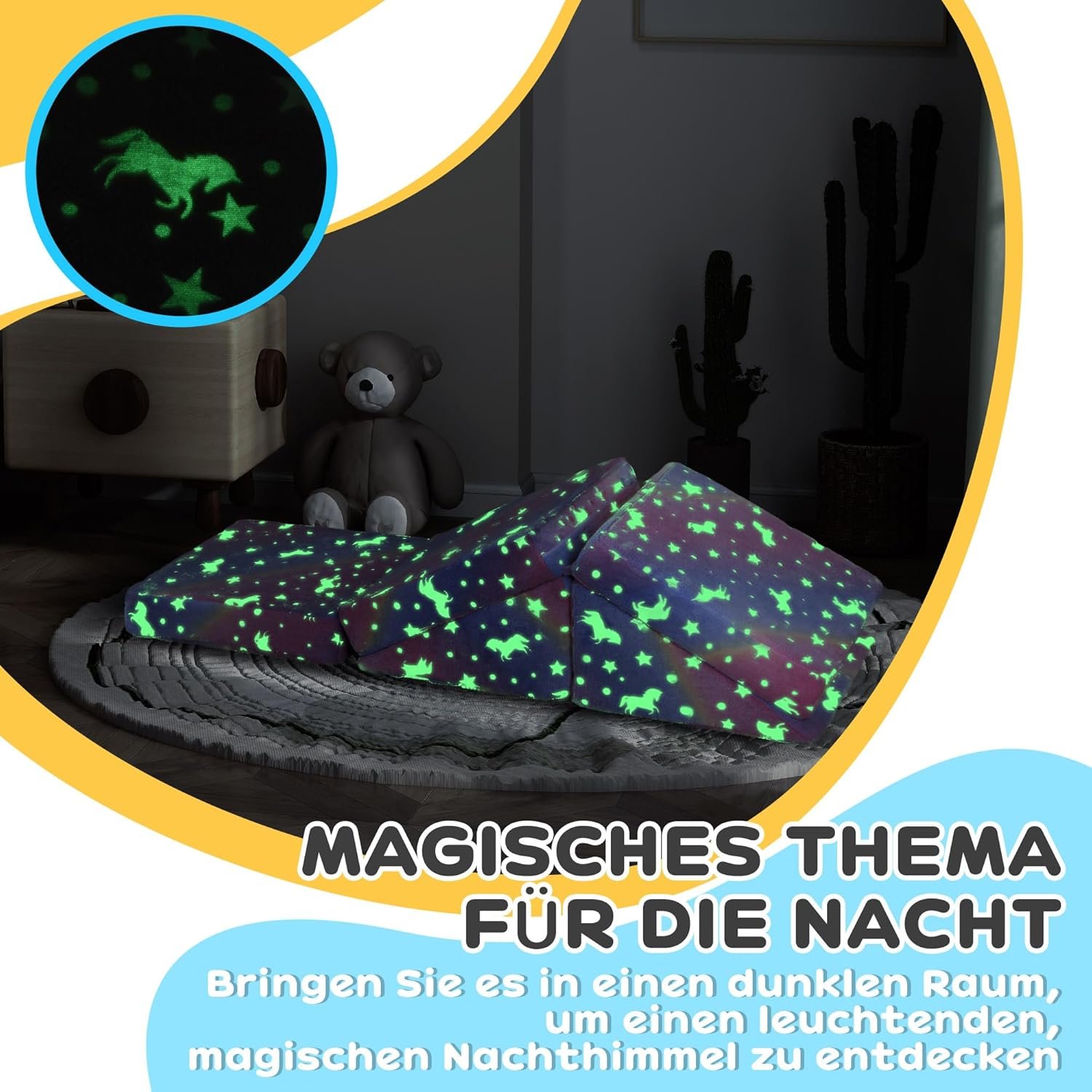 Диванът е украсен с пони и звезден мотив, който свети в тъмното и разкрива блестящо небе и дъга – създава мечтателна атмосфера и стимулира въображението. Тапицерията е от плътна и здрава пяна, която запазва формата си и издържа натоварване до 60 кг.