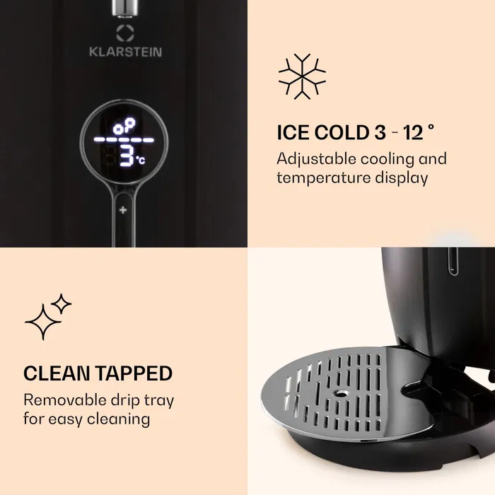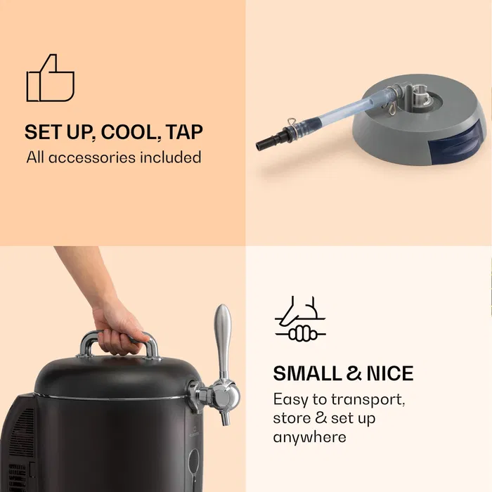Температурата на охлаждане се настройва между 3 и 12 °C и може да се следи лесно чрез LED дисплея. Индикаторът за нивото на бирата дава постоянен преглед на остатъка в бъчвата. Наливането е удобно, а сваляемата подложка за капки поддържа плота чист. Компактният размер позволява устройството да се използва навсякъде.