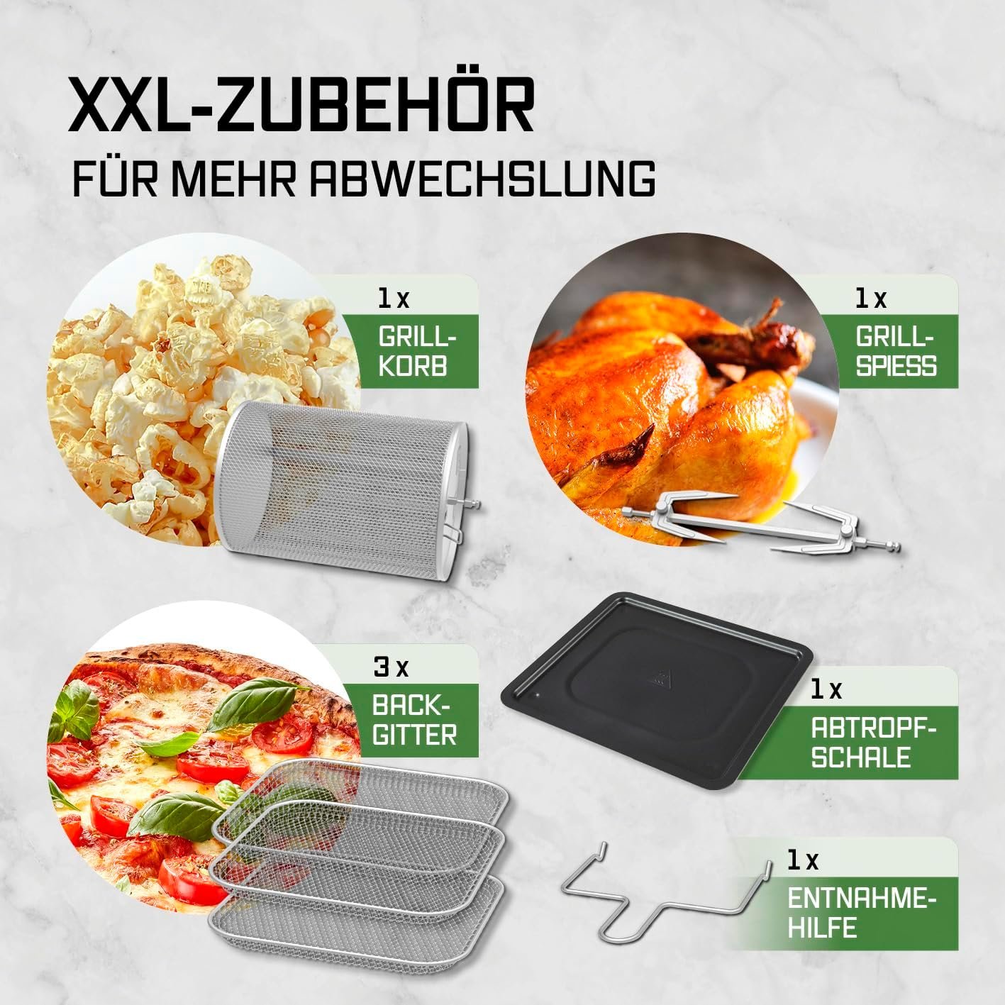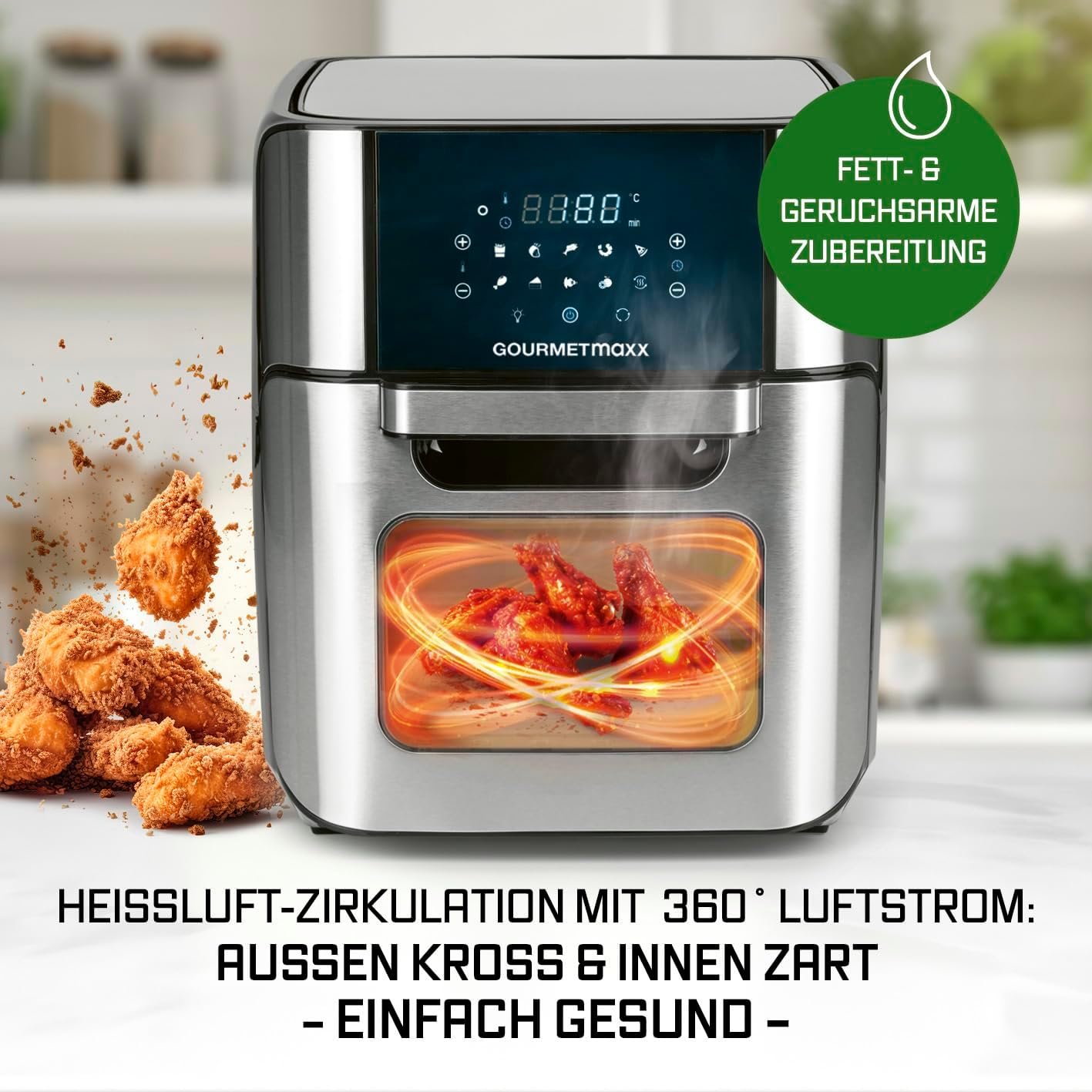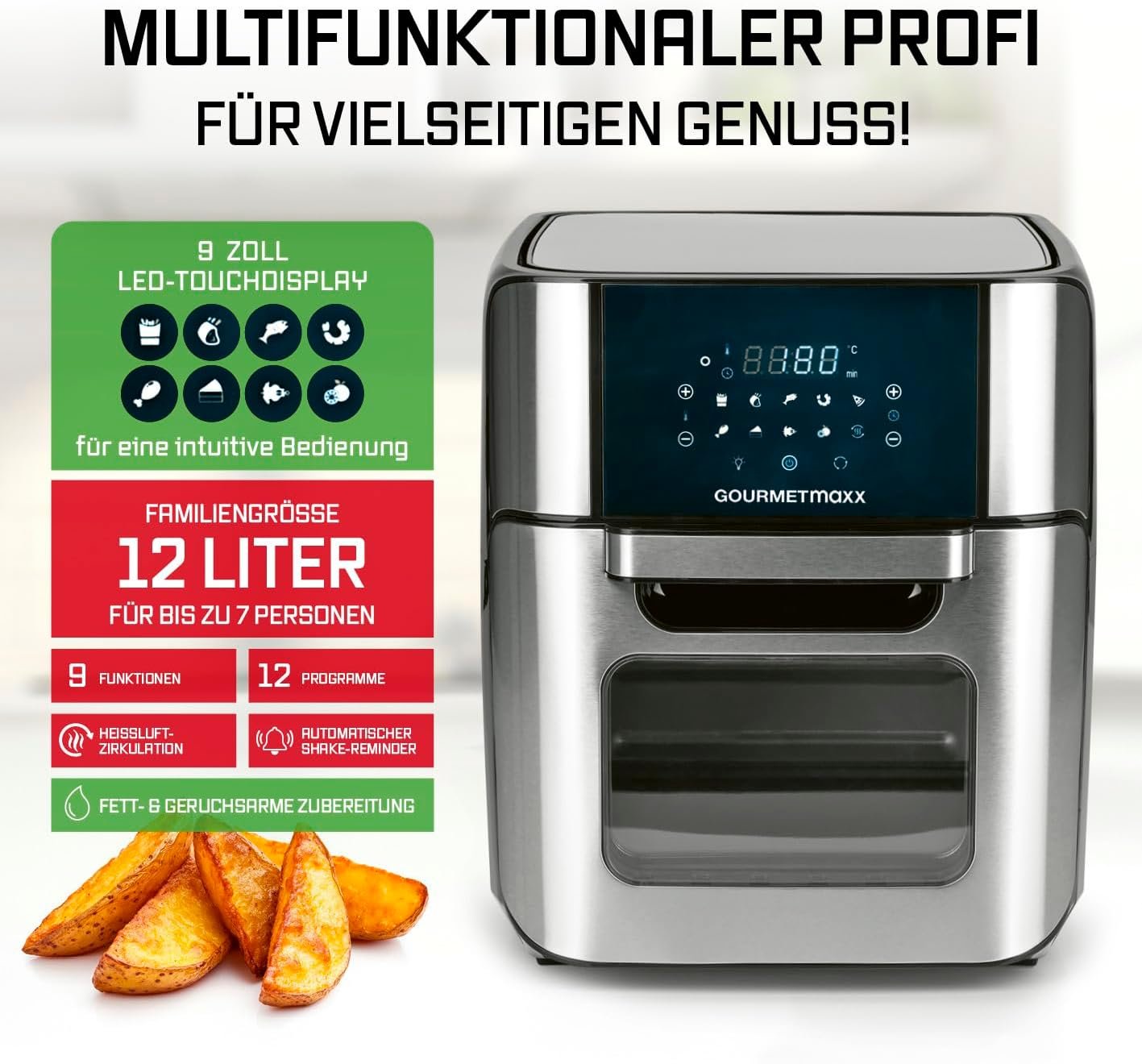 С голям капацитет и мощност 1800 W, той комбинира функции на фурна и грил и позволява пържене, печене и дехидратиране. Разполага със сензорен дисплей, 10 програми и таймер за лесно и удобно управление.
