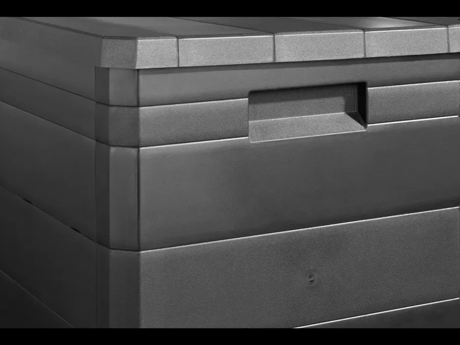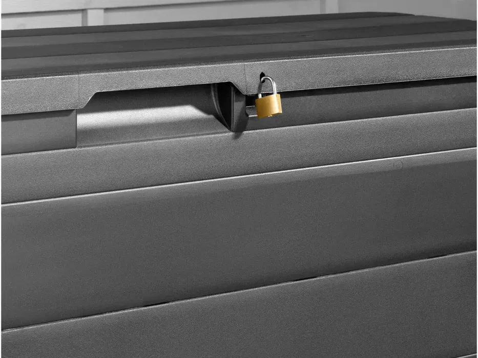 Капакът е с панти и разполага с 4 заключващи точки. Отстрани има вдлъбнати дръжки за лесно преместване, а кутията може да се заключва с катинар (не е включен). Монтажът е лесен, без нужда от инструменти, благодарение на щракващите конектори. В комплекта има инструкции за сглобяване.