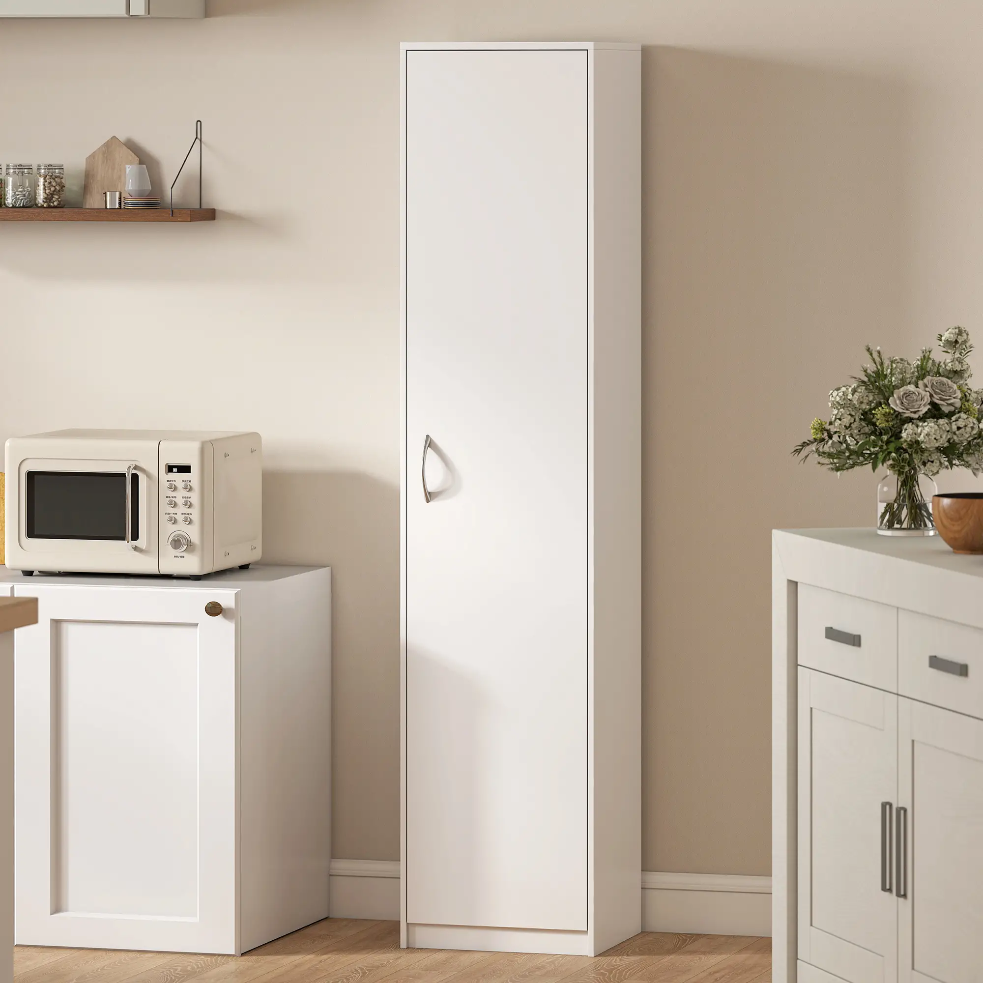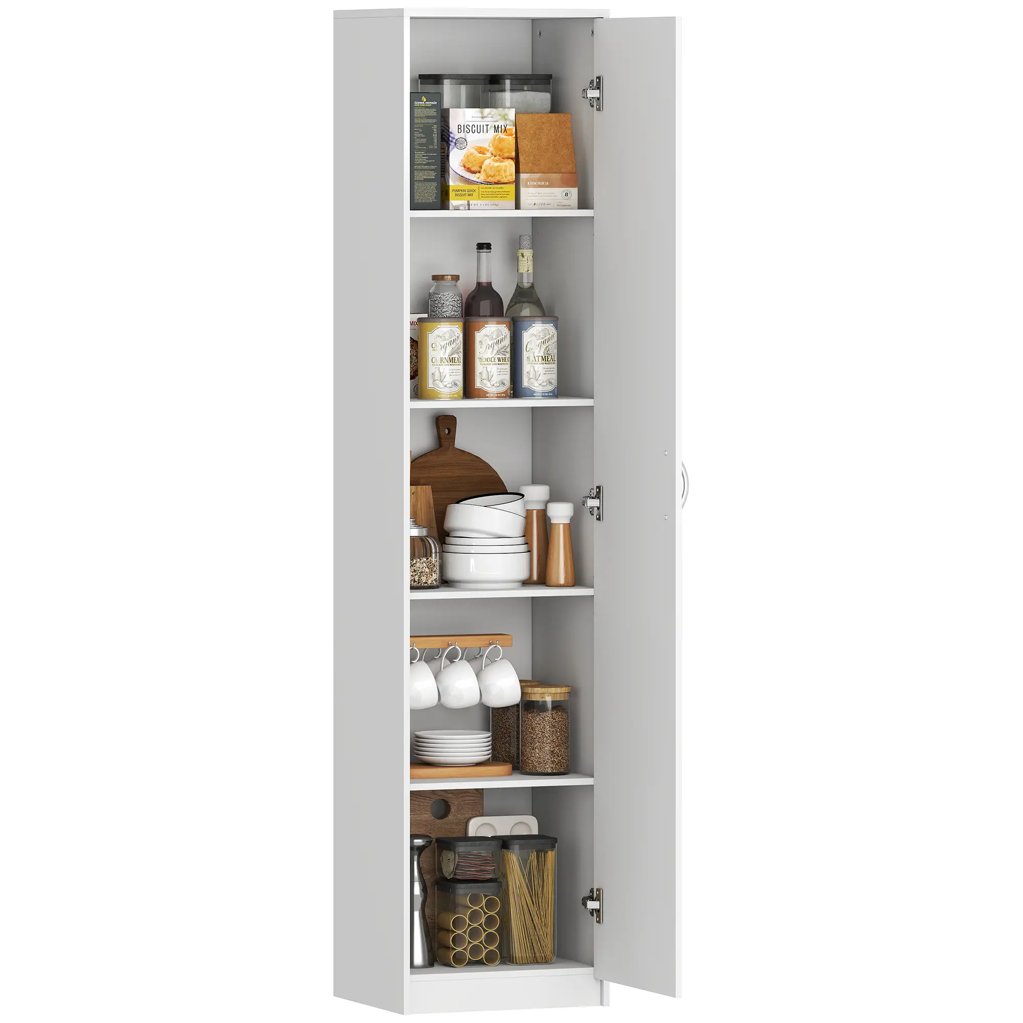 Кухненски шкаф HOMCOM е практично решение за съхранение в кухнята, килера или хола. Тесният дизайн позволява ефективно използване на пространството дори в малки помещения, като предлага достатъчно място за хранителни продукти, съдове и кухненски принадлежности.