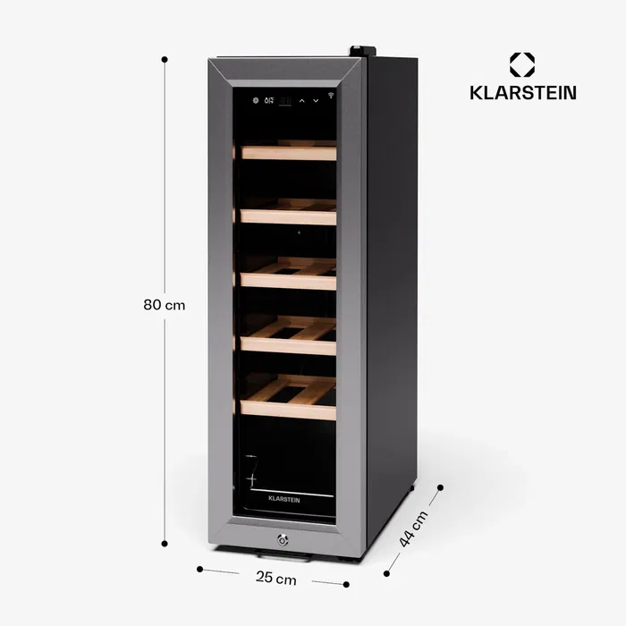 Охладител за вино Klarstein Shiraz Premium Smart 12 Slim съчетава функционалност, модерен дизайн и интелигентни функции, което го прави незаменим спътник за любителите на вино, които искат да представят колекцията си със стил и да я съхранят по най-добрия възможен начин.