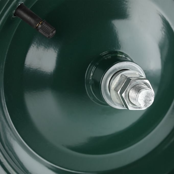Стоманената джанта със сачмени лагери гарантира гладко въртене и по-лесно бутане при тежък товар. Колелото се надува бързо чрез автомобилен вентил и е готово за употреба веднага след поставяне.