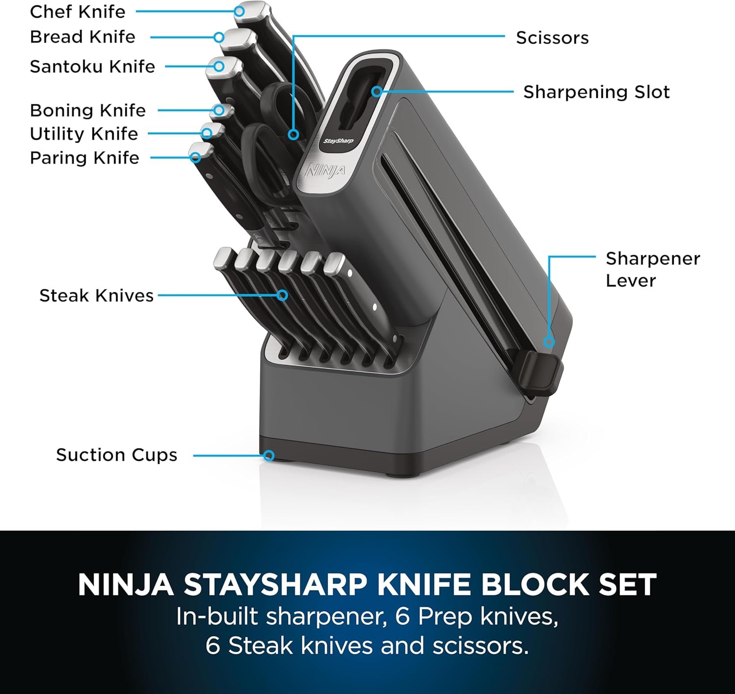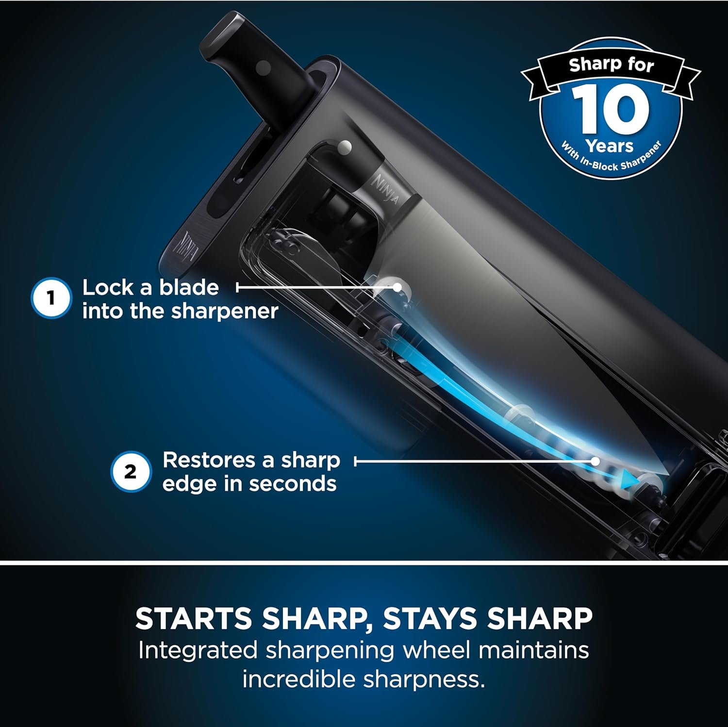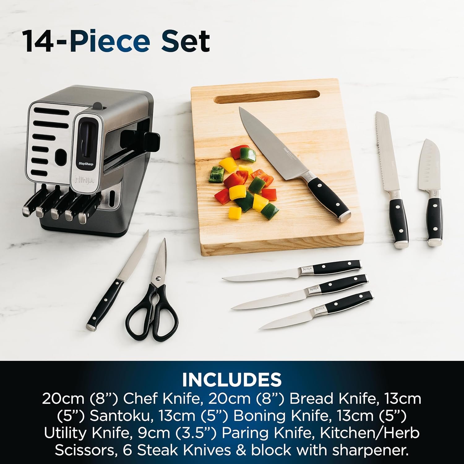 14-частният комплект ножове Ninja StaySharp е създаден за прецизна работа в кухнята и дълготрайна употреба. Остриетата са изработени от немска неръждаема стомана, известна със здравината и устойчивостта си при ежедневна работа.