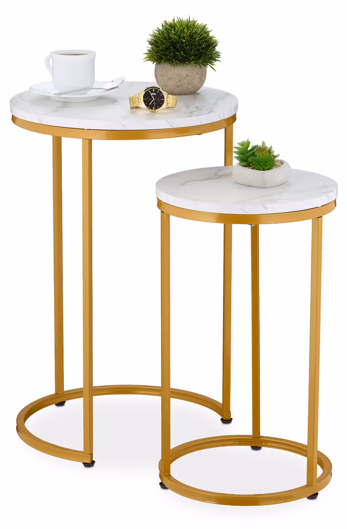 Подходящи са за поставяне на напитки, книги, будилник, лампа или декоративни предмети. Плотът с мраморен ефект и металните крака създават стилен контраст, който се вписва добре в модерни интериори. В хола служат като масички за кафе, а до леглото се превръщат в нощни шкафчета. Конструкцията е стабилна, а товароносимостта е достатъчна за ежедневна употреба.