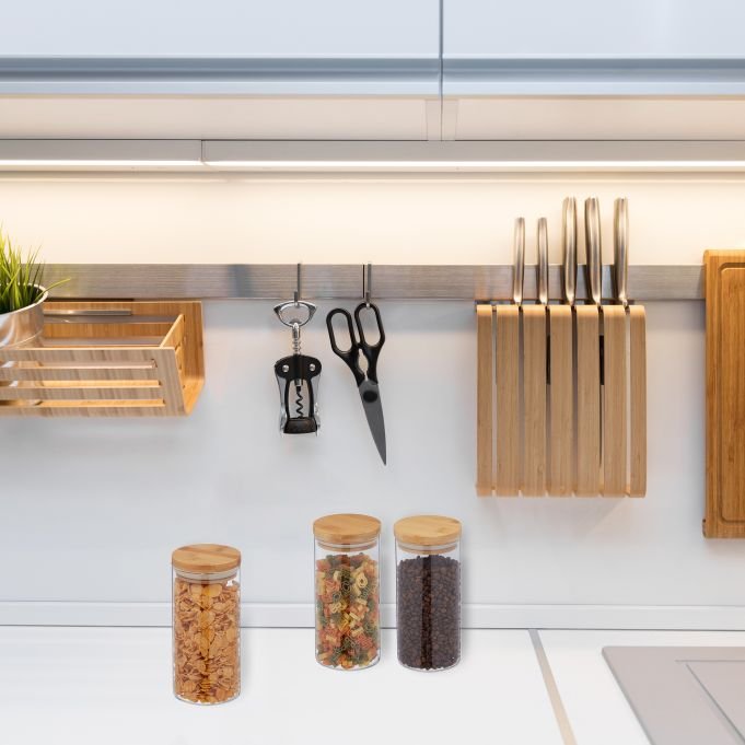 Всеки буркан е оборудван с бамбуков капак със силиконов пръстен, който осигурява херметично затваряне и поддържа съдържанието свежо за по-дълго. Прозрачният дизайн позволява лесна видимост на продуктите, а естественият бамбук добавя топъл акцент към кухненския интериор.