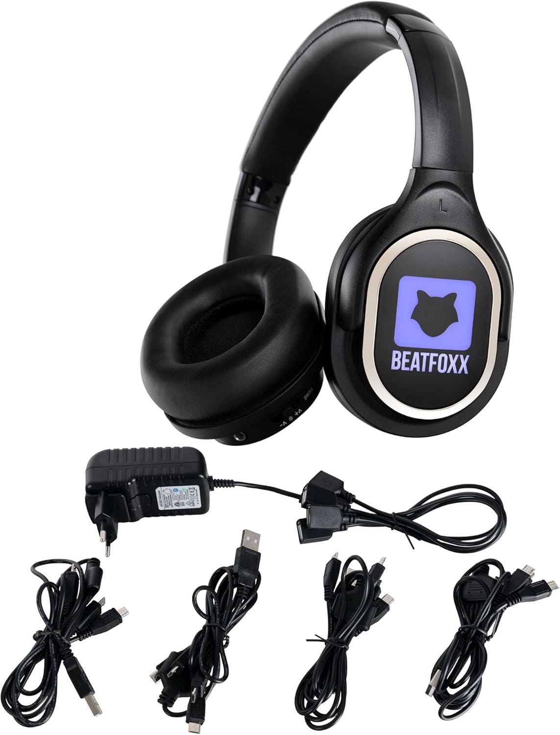 В комплекта са включени 32 безжични стерео слушалки и 2 зарядни устройства, което го прави подходящ за партита, фестивали, събития и клубни активности. Слушалките разполагат с 3 приемни канала, като LED осветлението показва избрания канал в синьо, червено или зелено. Вградената литиево-полимерна батерия осигурява над 10 часа работа, а меките въртящи се наушници и регулируемата лента за глава гарантират удобство при продължително носене.