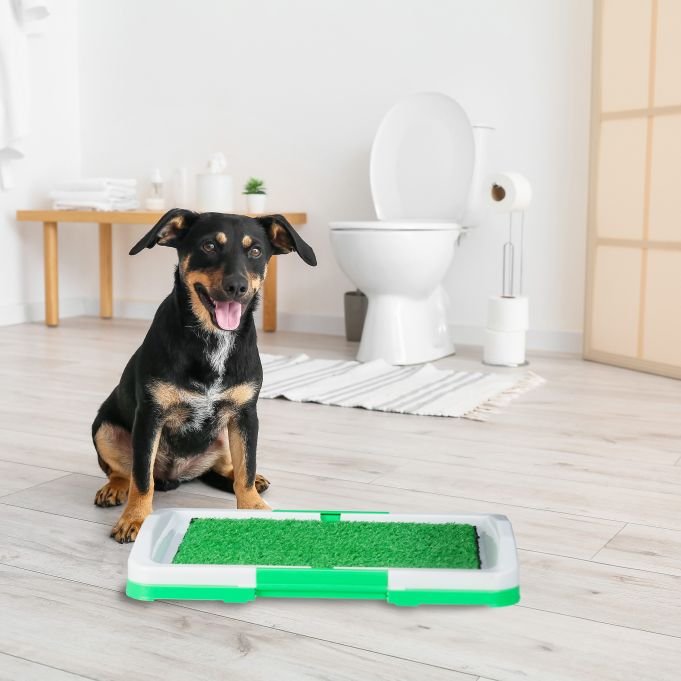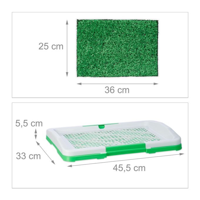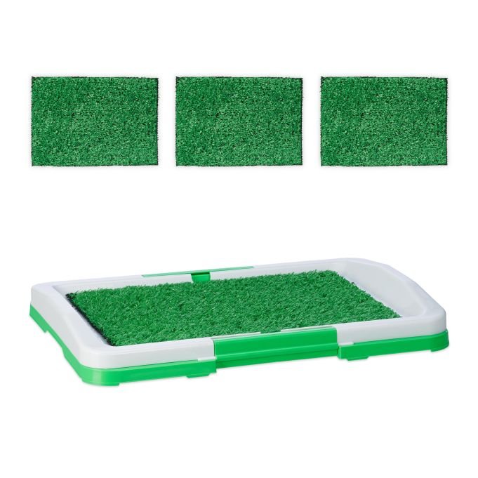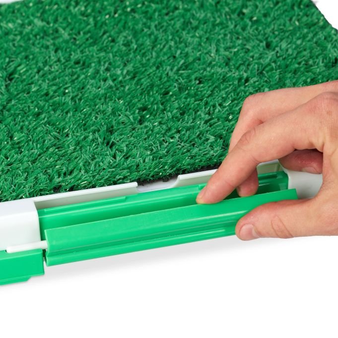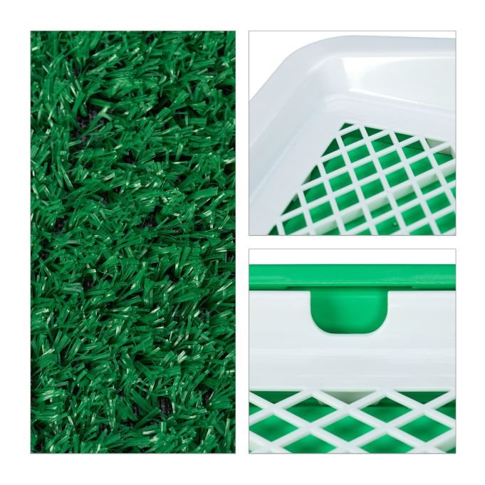 Изкуствената тревна повърхност изглежда естествено и задържа неприятните миризми, а урината се стича в долната тава, която се почиства лесно. Подвижната решетка поддържа повърхността суха и предотвратява разливане. Изработена от пластмаса, тази тоалетна е практична за поддръжка и подходяща за продължителна употреба в жилищни помещения.