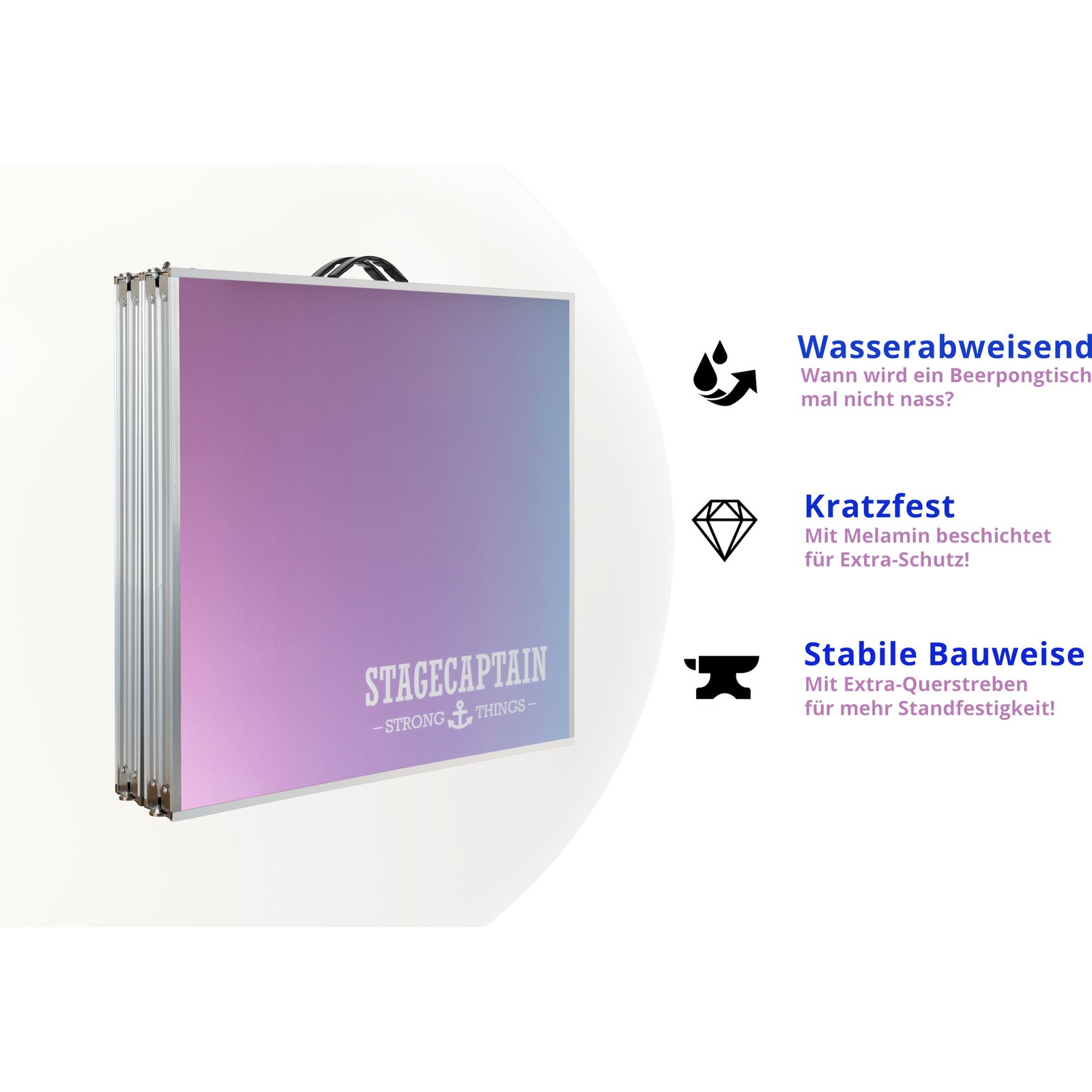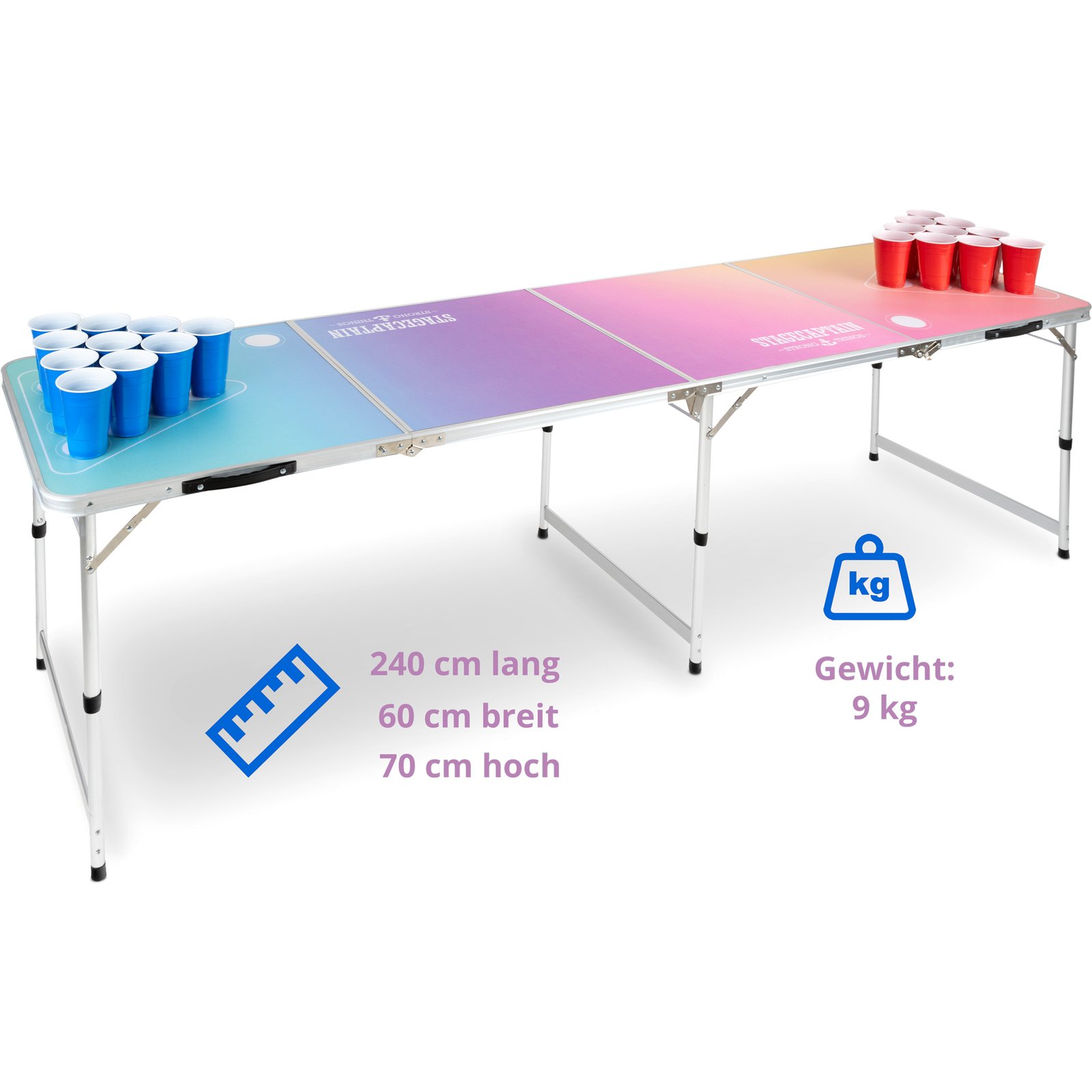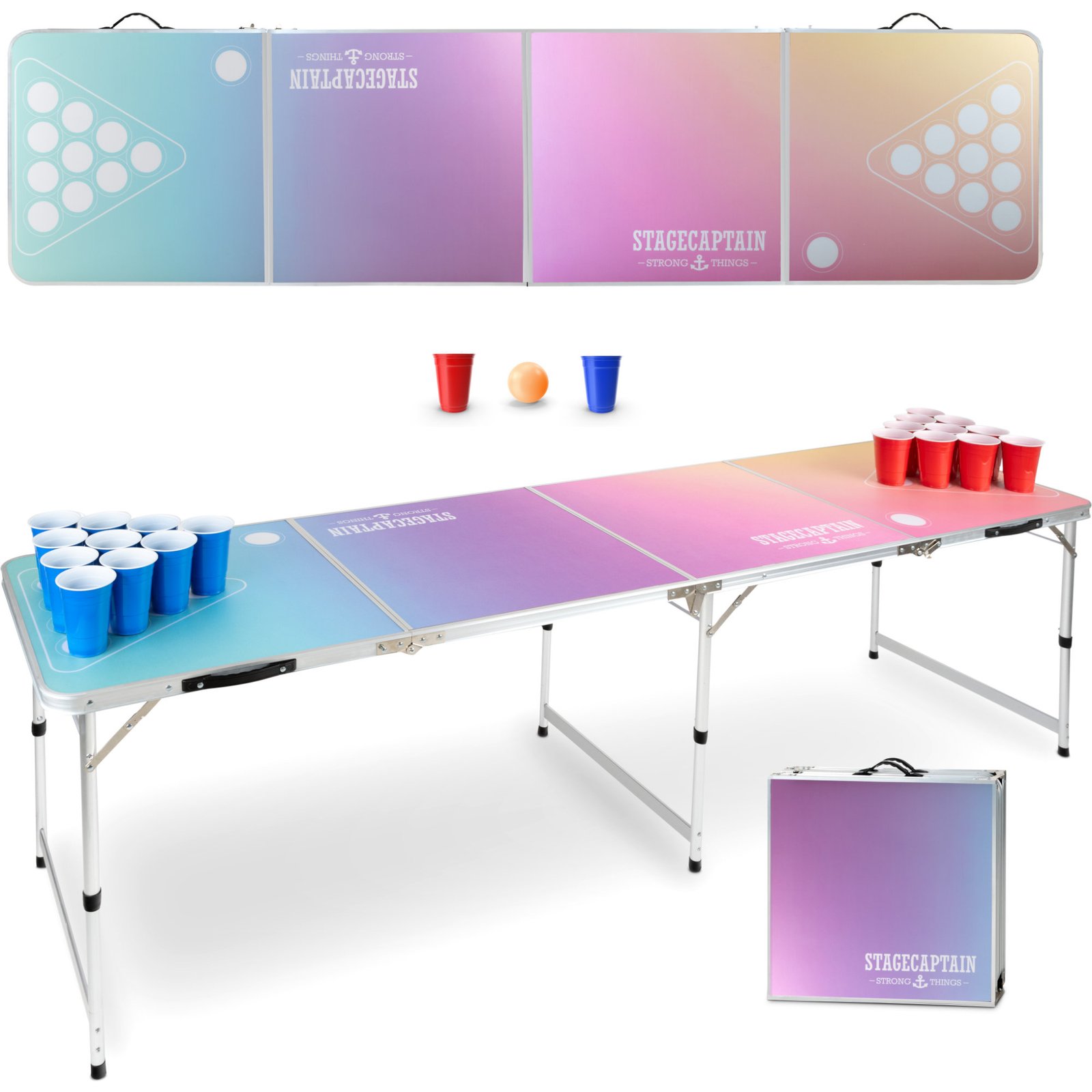 Маса за бира понг Stagecaptain „Club“ е сгъваема парти маса, създадена специално за игра на beer pong и други забавления. Благодарение на сгъваемата конструкция се разгъва за около 90 секунди и може лесно да се пренася и съхранява.
