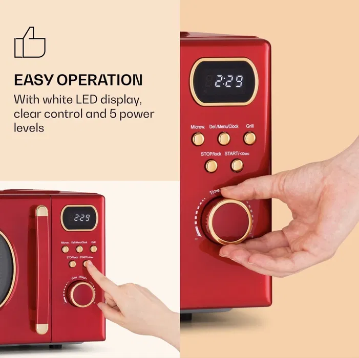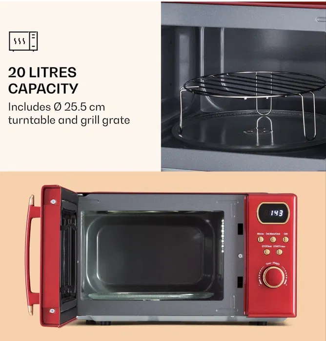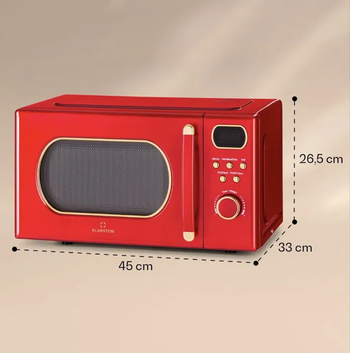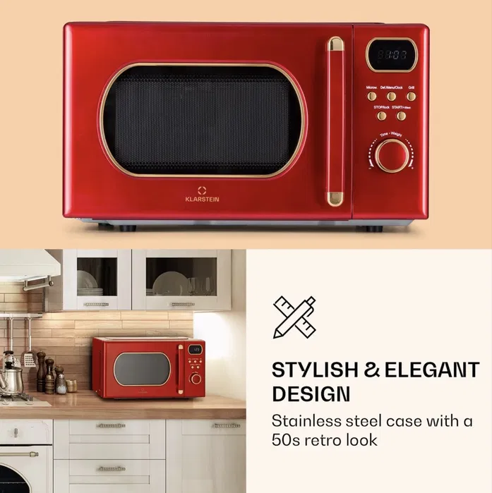 Микровълновата фурна Klarstein Julieta е вашият идеален кухненски помощник, който комбинира функционалност, стил и иновативни технологии. Създадена, за да улесни вашето ежедневно готвене с елегантен ретро дизайн и модерни възможности.