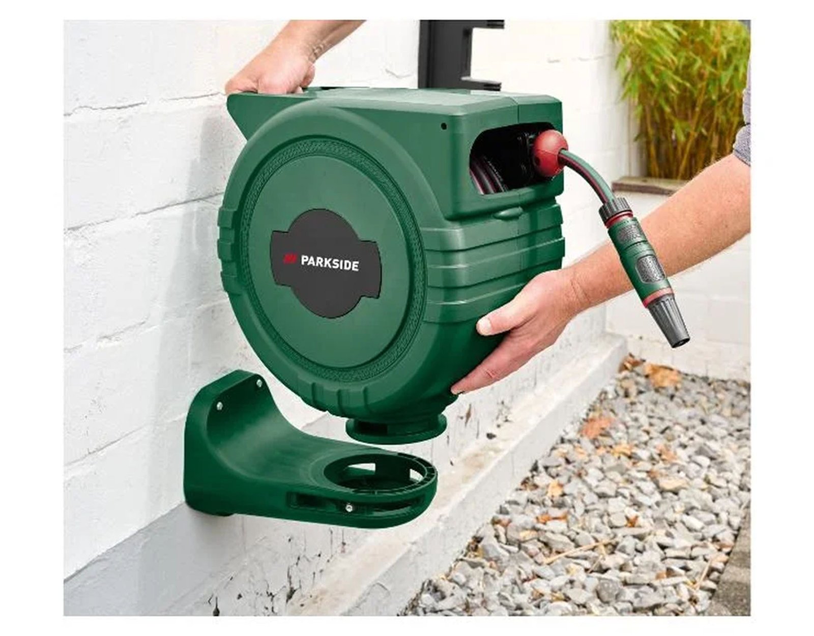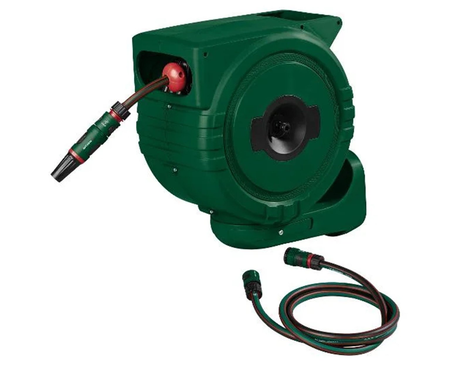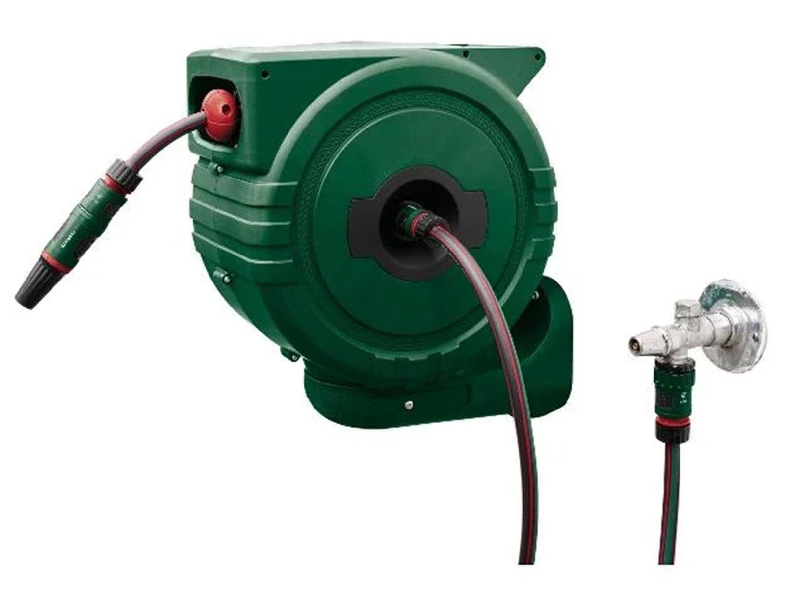 След работа автоматичният механизъм го прибира плавно, без оплитане и без ръчно навиване. Четирислойният маркуч е стабилен, гъвкав и не се прегъва, а пръскачката е плавно регулируема от фина мъгла до струя. Устойчивостта на UV и атмосферни условия позволява монтаж на външна стена през целия сезон. В комплекта има всички нужни съединения и адаптери.
