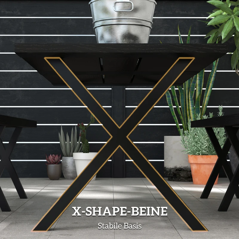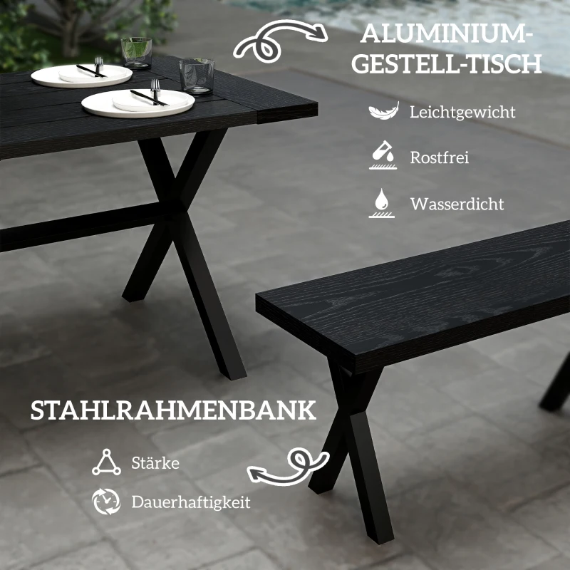 Кръстообразните крака гарантират висока стабилност, а алуминиевият плот с дървесен десен придава елегантен външен вид. Отворът за чадър добавя допълнителен комфорт в слънчеви дни. Издръжливите материали правят комплекта устойчив на атмосферни влияния и подходящ за дългосрочна външна употреба.