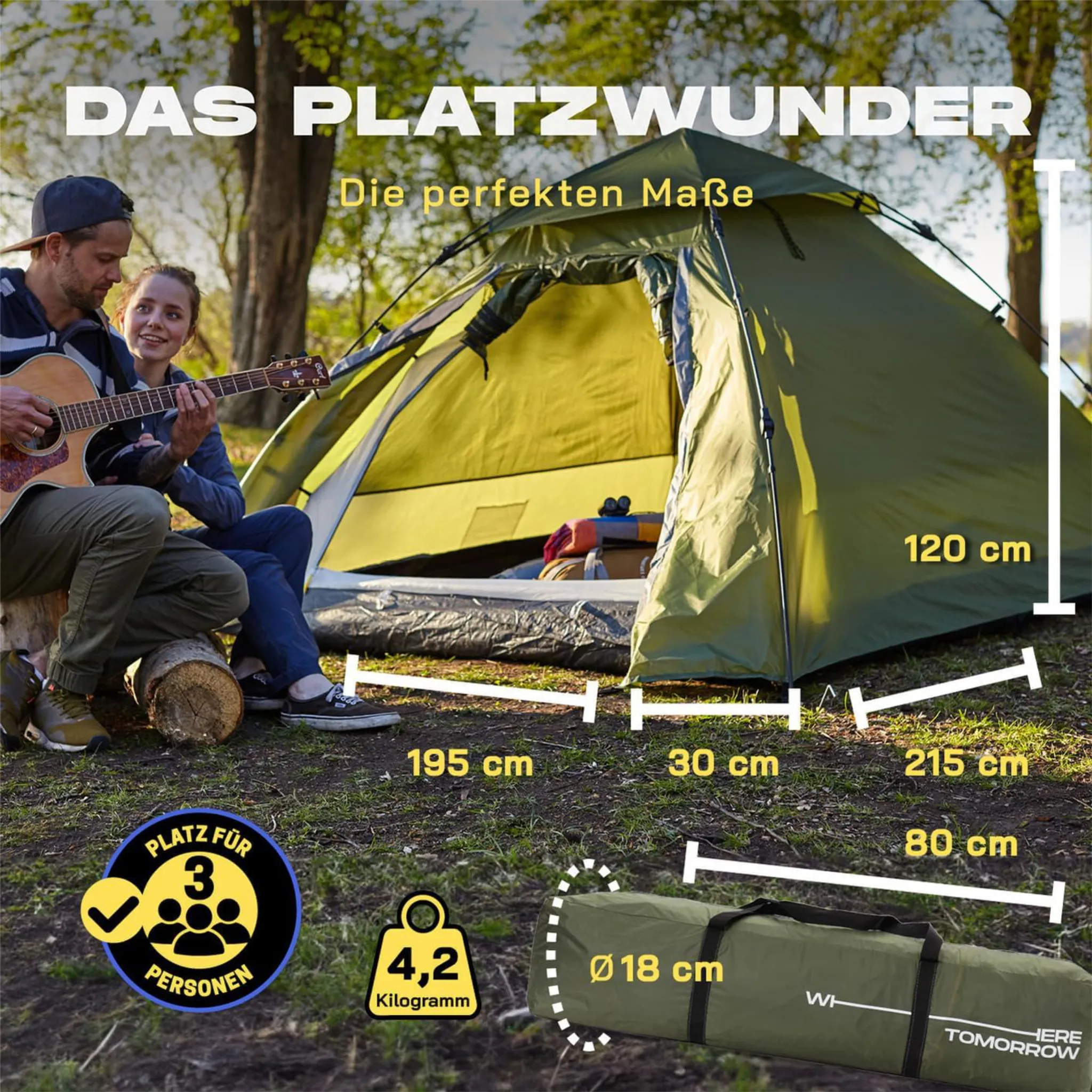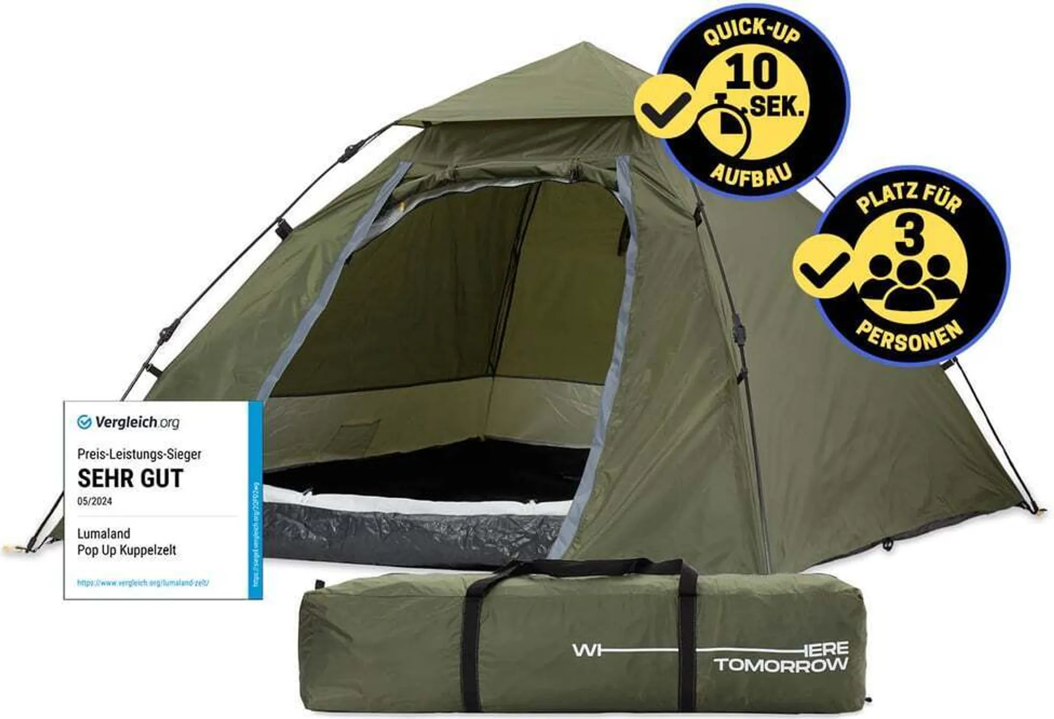 Поп-ъп куполната палатка е практично решение за къмпинг, фестивали, пътувания или плаж. Разпъва се за секунди чрез интелигентна система без класически монтаж – издърпват се предпазните въжета, разгъват се шарнирните пръти и се фиксира с коловете.