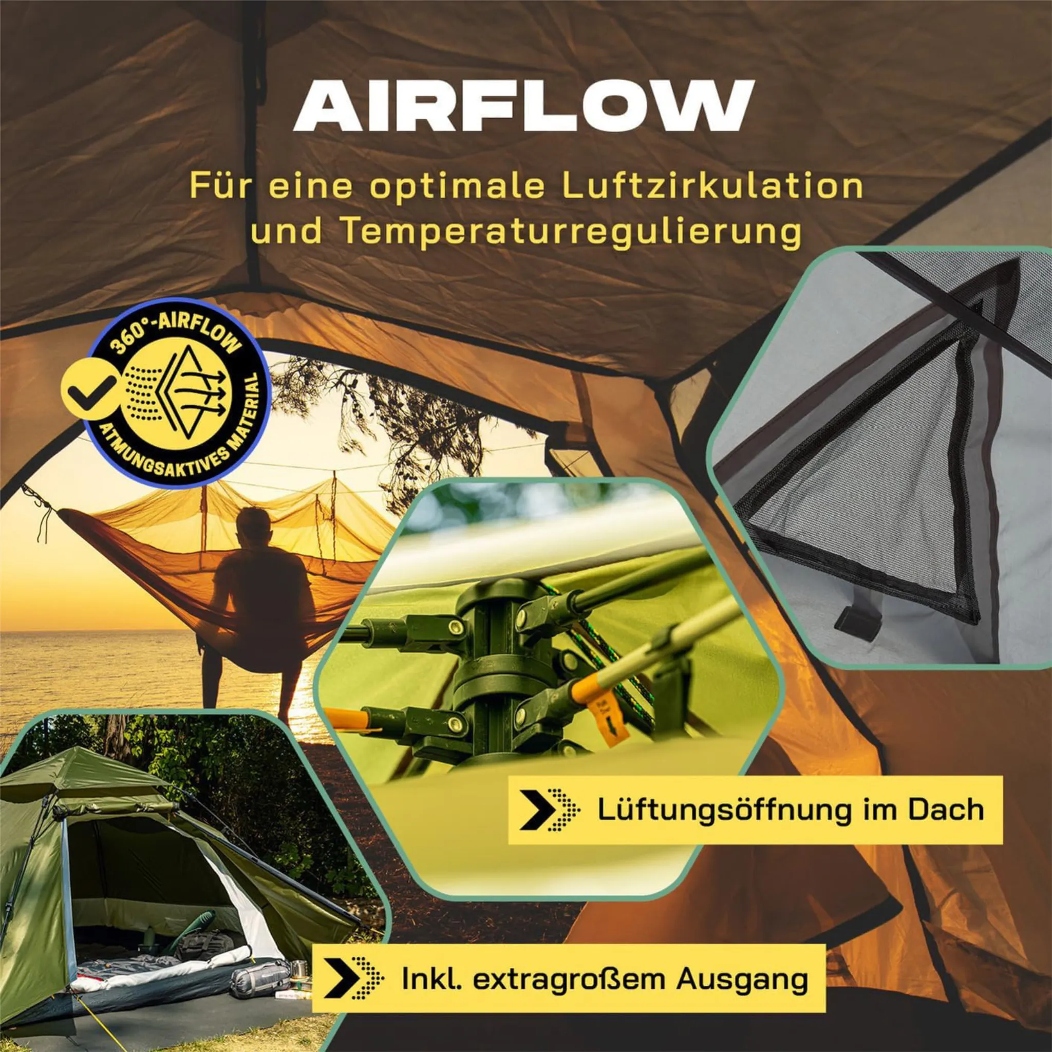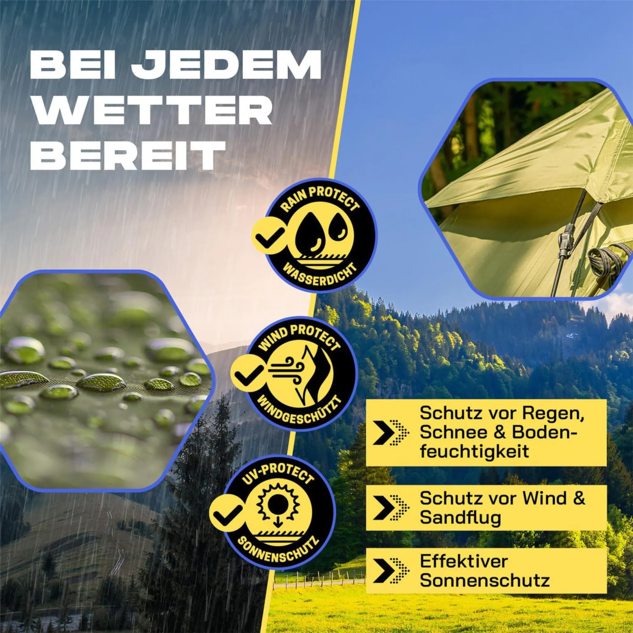 Осигурява защита от слънце, дъжд, вятър и пясък, което я прави подходяща за различни условия на открито. Повишената подложка пази от влага и замърсяване, а свързаната външна и вътрешна част подобрява стабилността. Покривният вентилационен отвор и допълнителният капак позволяват циркулация на въздуха, без да влиза вода. Мрежата против комари на входа дава възможност за проветряване без насекоми. Вътрешният джоб е удобен за телефон, очила и дребни вещи. Палатката идва с въжета, колове и чанта за лесно пренасяне.