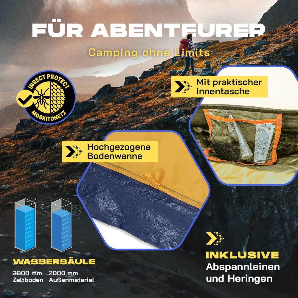 Палатката осигурява защита от вятър, дъжд, сняг и влага от земята, което я прави подходяща за използване при различни условия на открито. Двата входа осигуряват по-лесен достъп и по-добра вентилация. Вътрешният джоб позволява съхранение на малки вещи като телефон, фенер или аксесоари, за да са винаги под ръка.