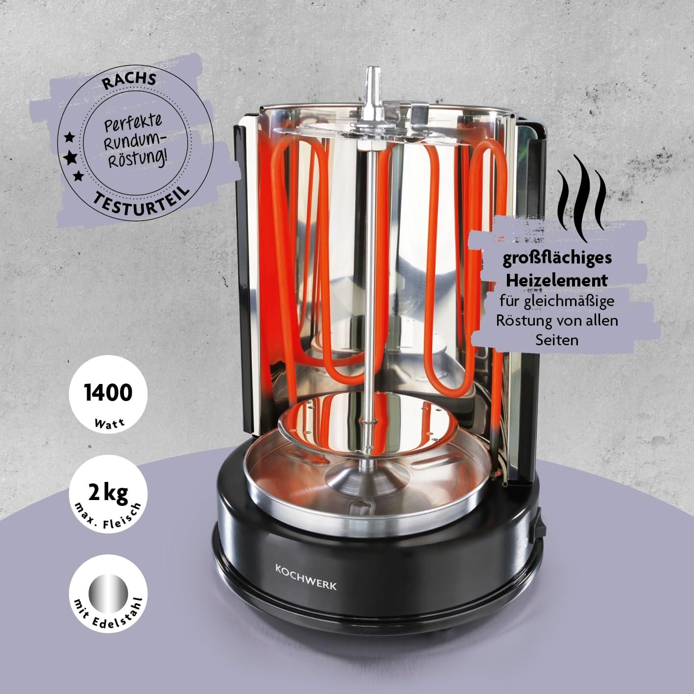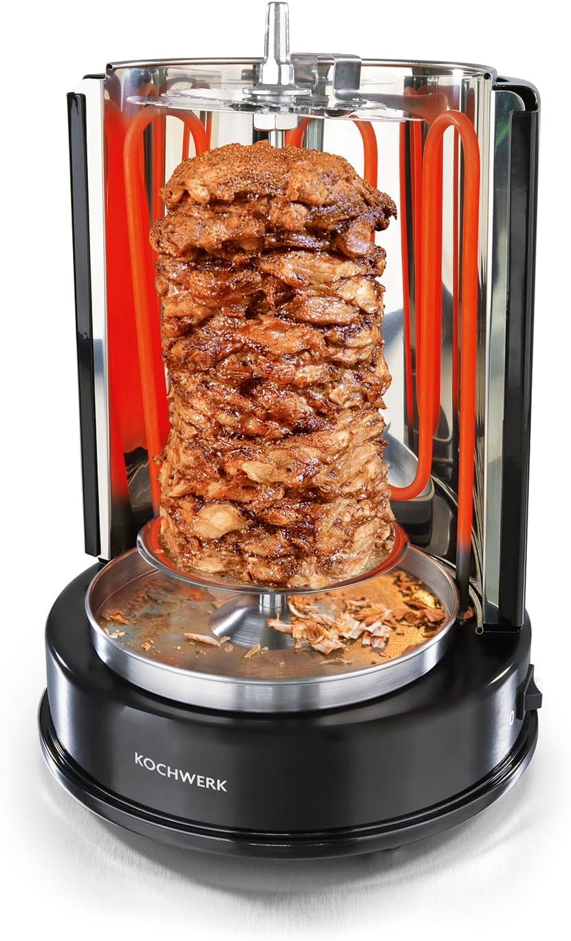 Вертикалният грил Rachs KOCHWERK е удобно решение за приготвяне на кебап, гирос, пиле и зеленчуци у дома с минимално количество мазнини.