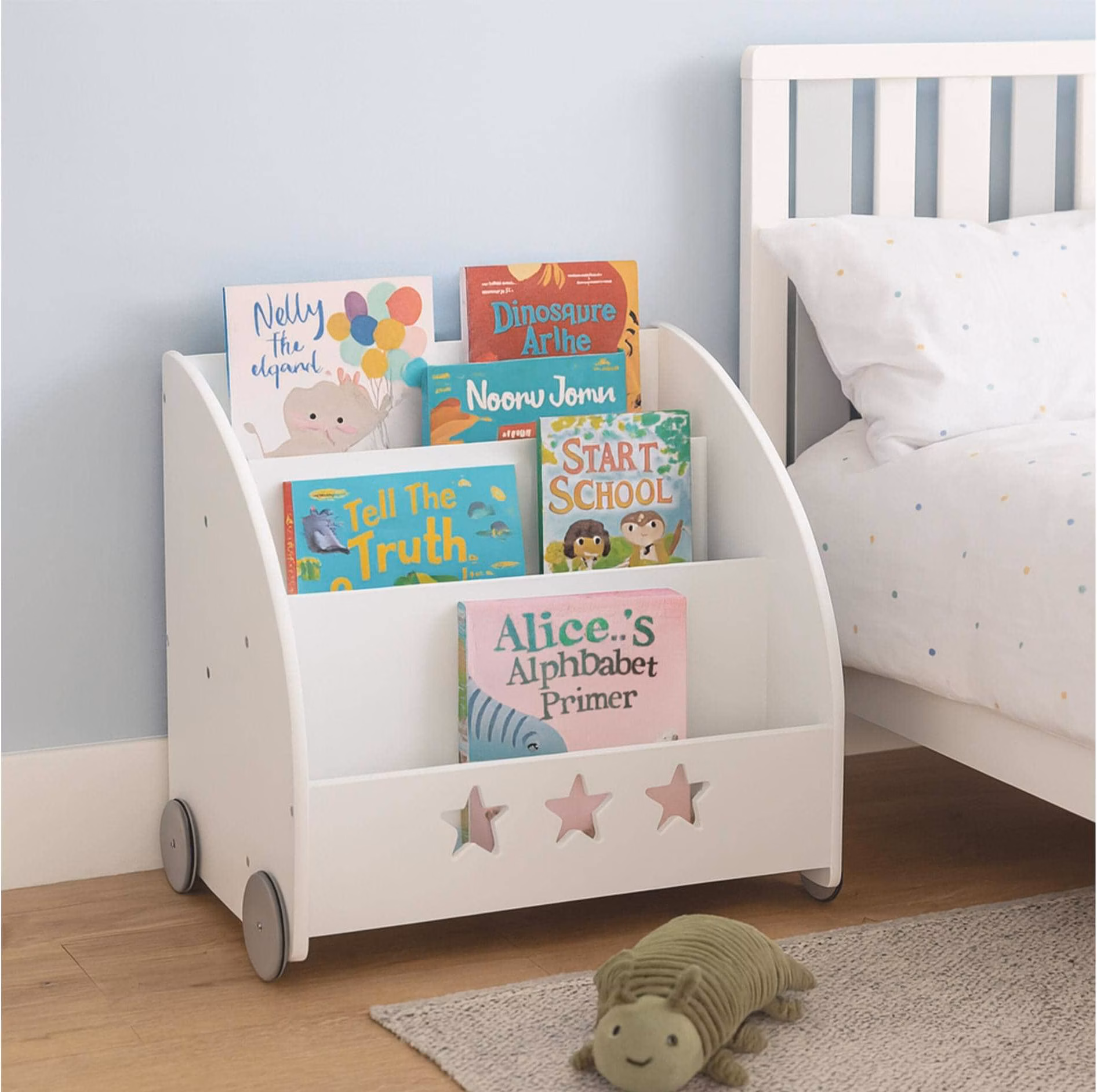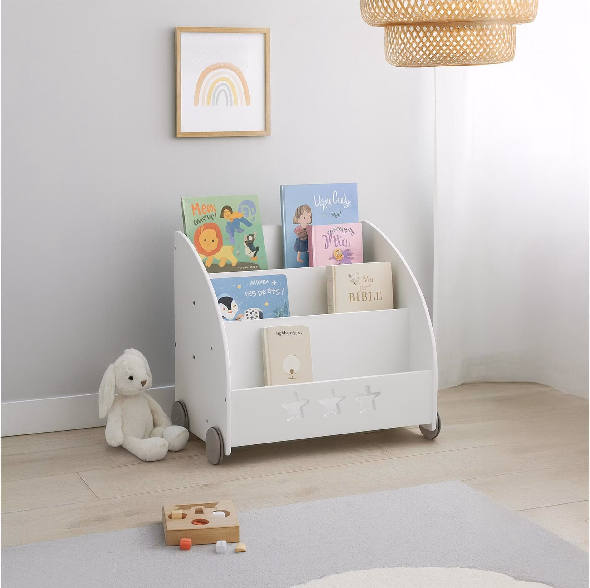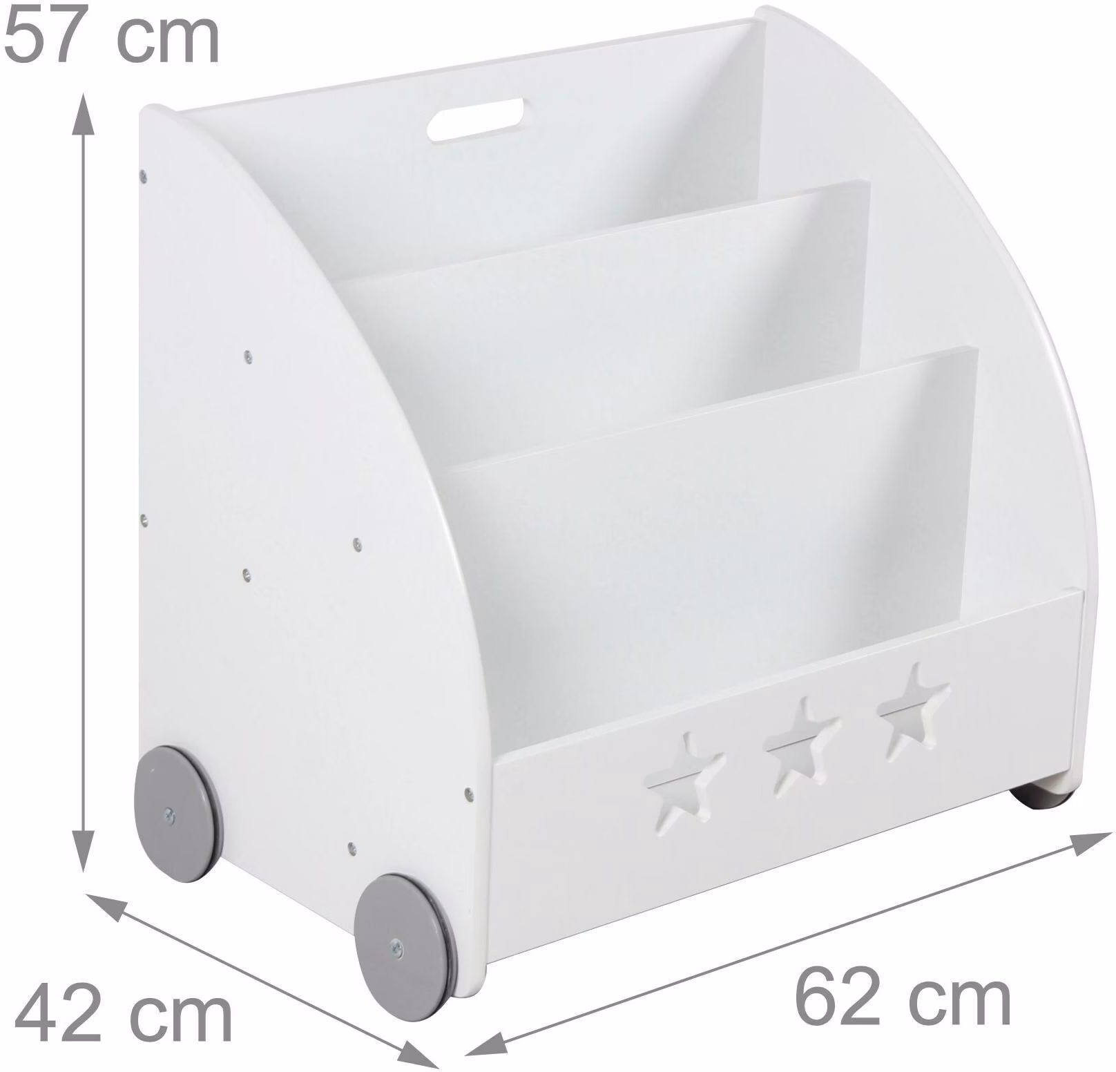Трите отворени отделения са на достъпна за децата височина, което насърчава самостоятелност и навици за подреждане. Заоблените ръбове намаляват риска от нараняване, а стабилната конструкция е устойчива на преобръщане. Гумираните колела позволяват лесно преместване, без да се драска подът. Декоративният звезден мотив придава приятен и игрив вид.