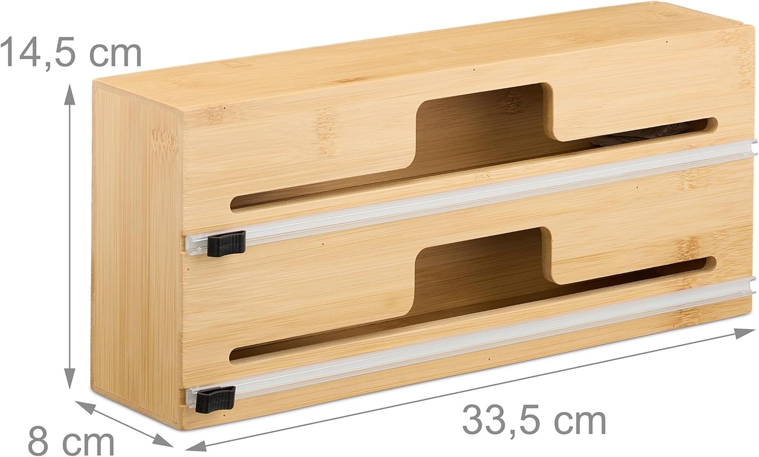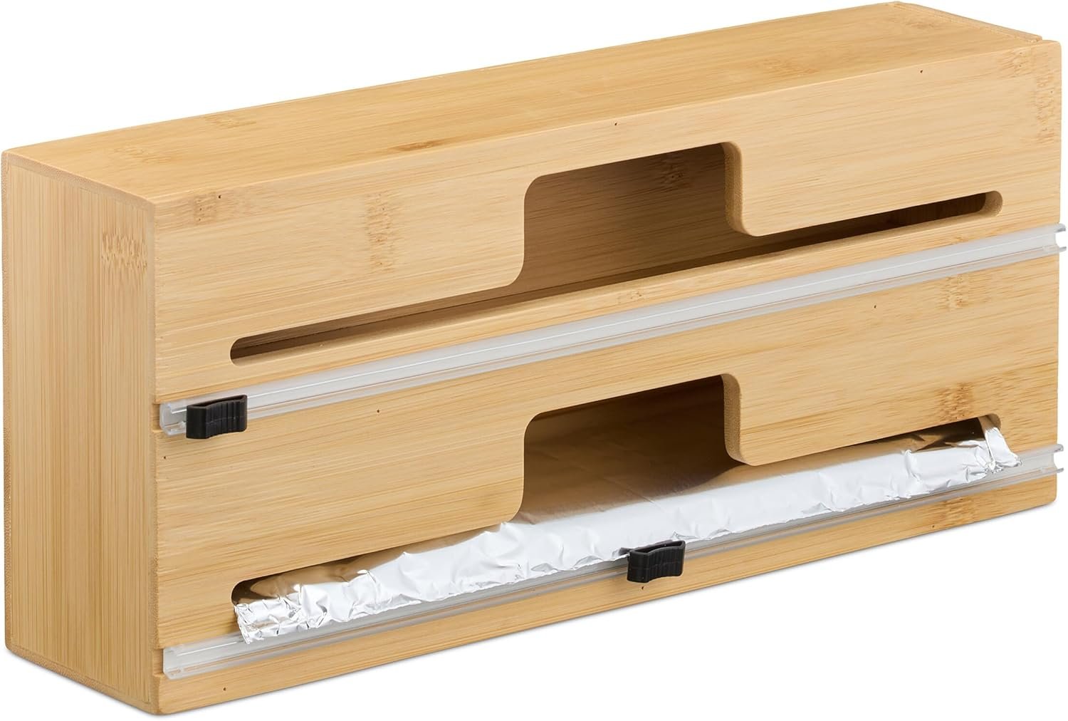 Този бамбуков диспенсер за фолио е създаден за подредено съхранение в чекмеджето и лесна работа с алуминиево и прозрачно фолио.