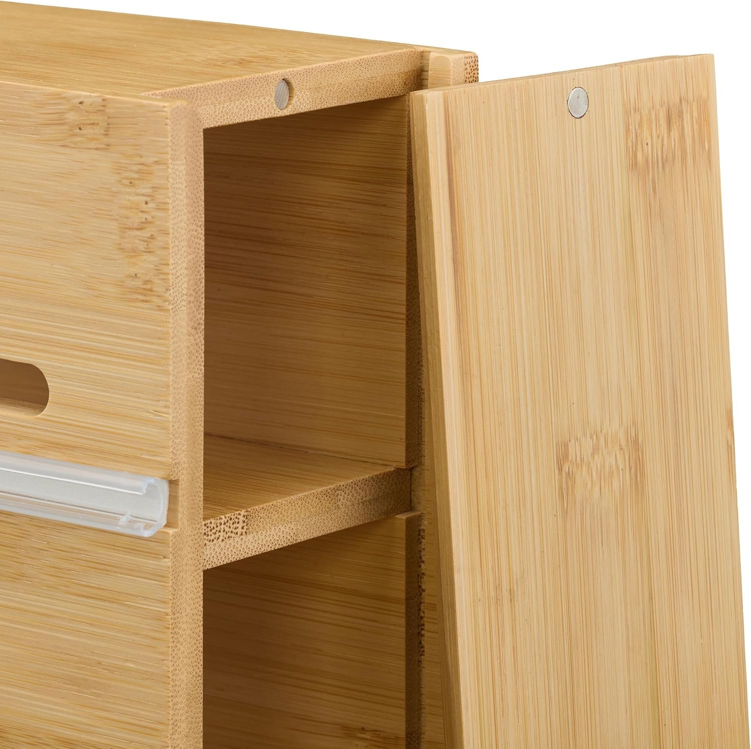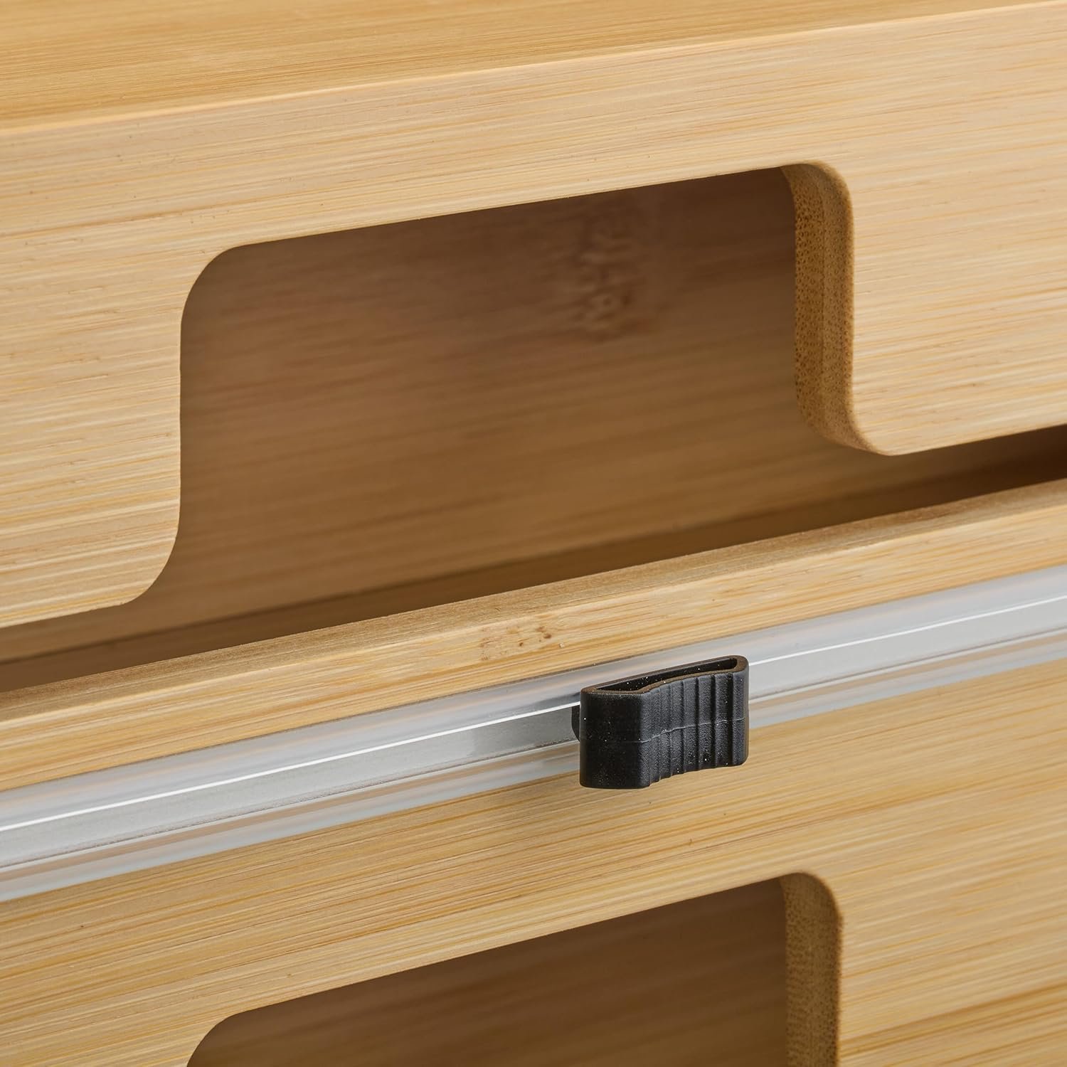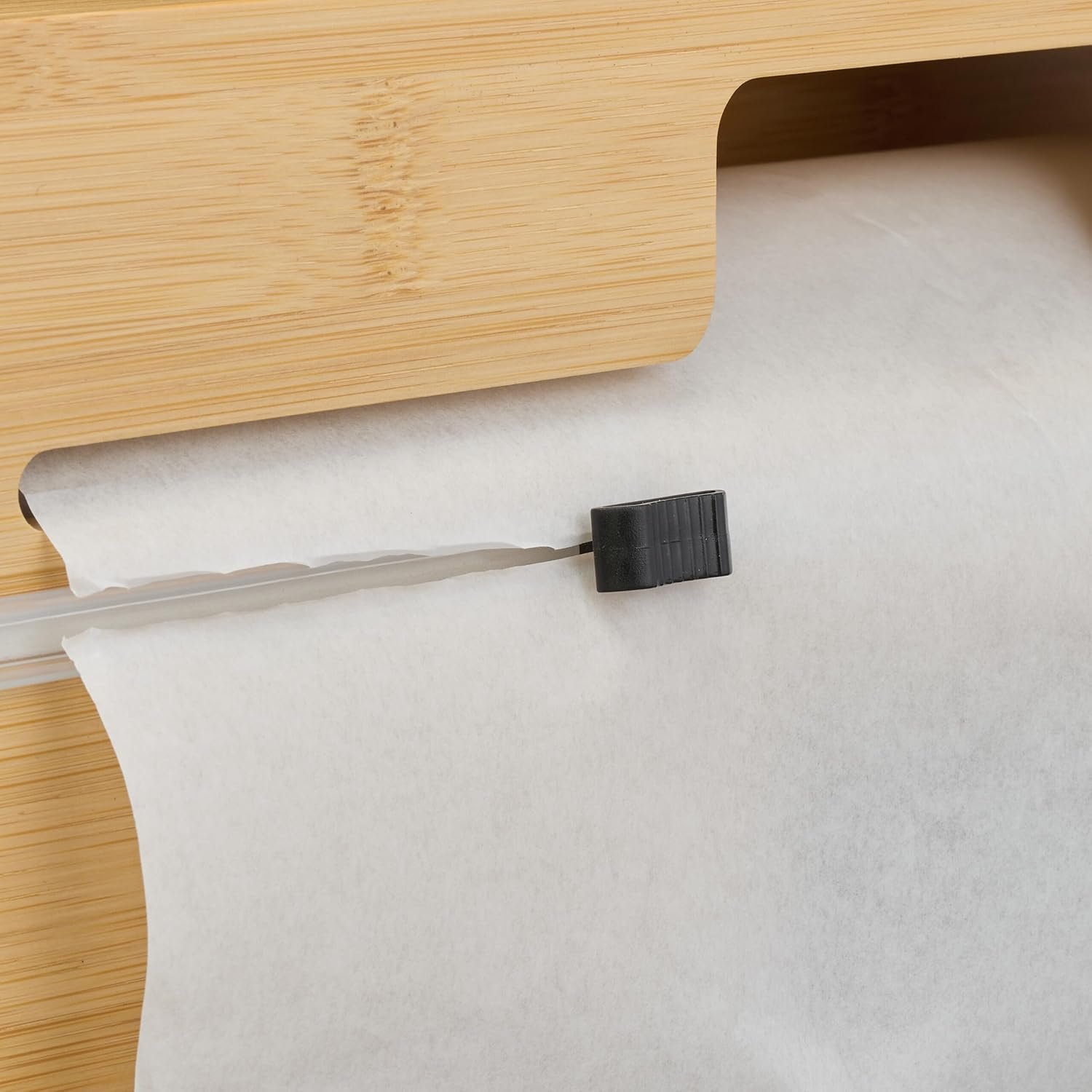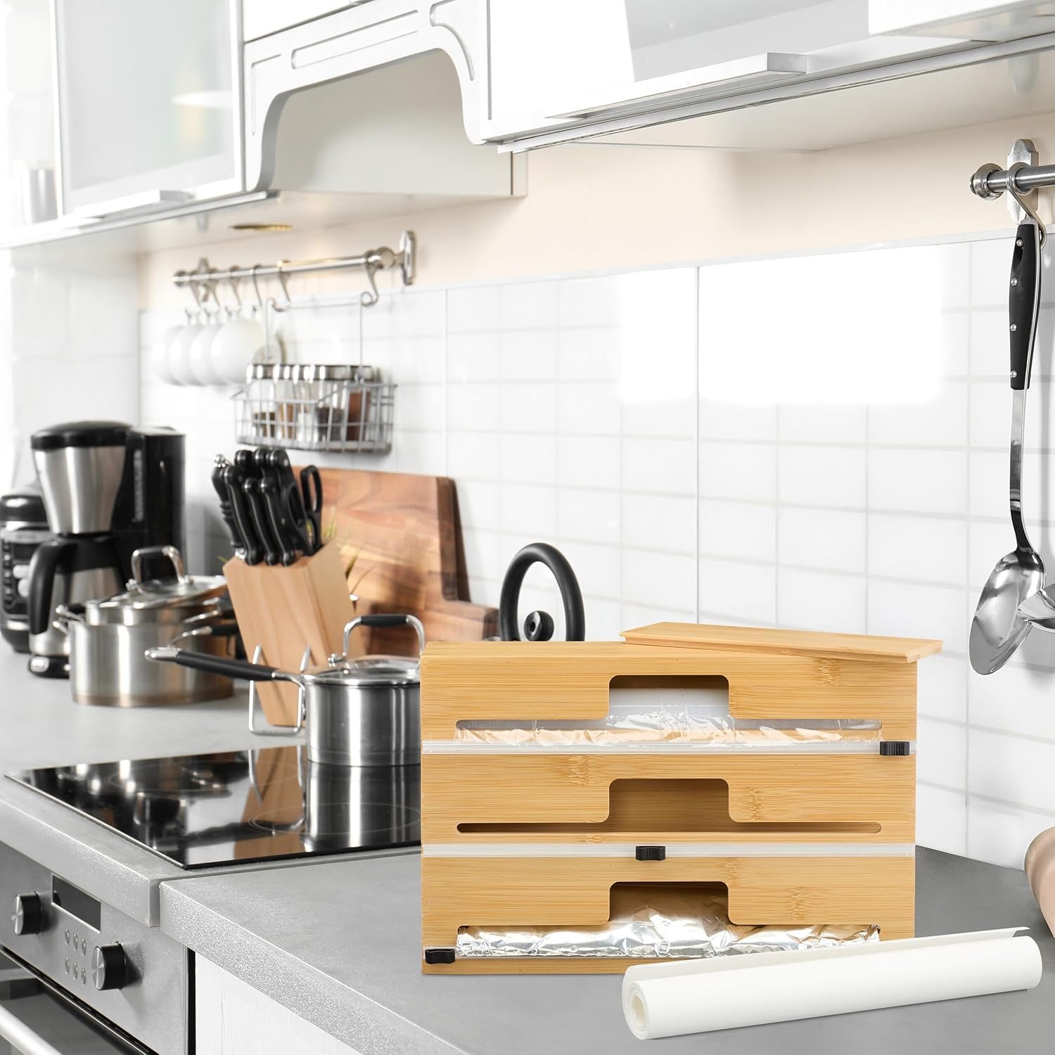 Вграденият нож осигурява чисто и гладко рязане, без накъсване и без сплъстени ръбове. Остриетата са скрити за по-висока безопасност, а страничната стена с магнит прави пълненето лесно. Натуралният бамбук добавя топъл акцент в кухнята и помага за по-добрата организация на ролките.