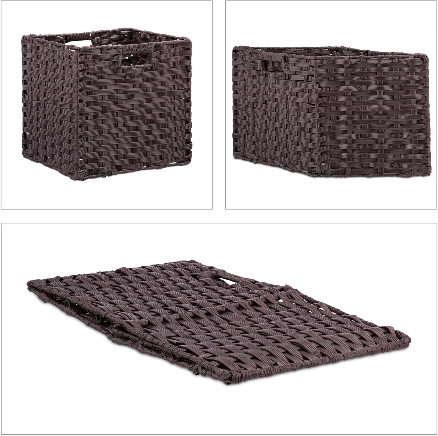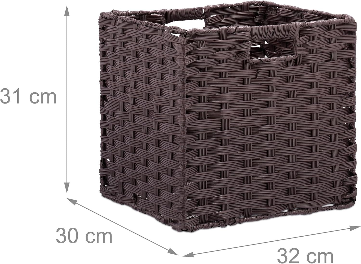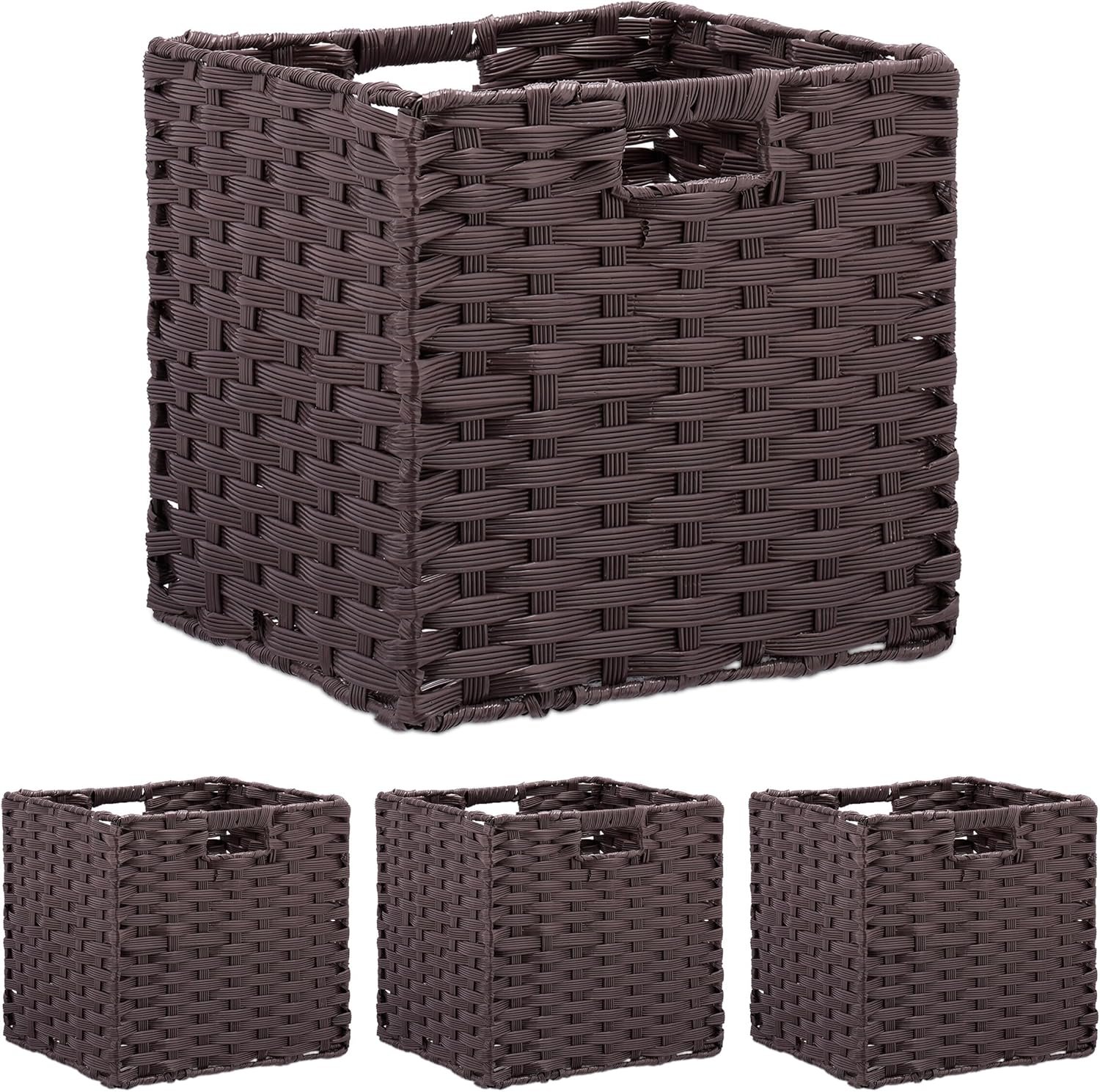 Този комплект Relaxdays включва 4 кафяви плетени кошници за съхранение, подходящи за дрехи, играчки и различни аксесоари.