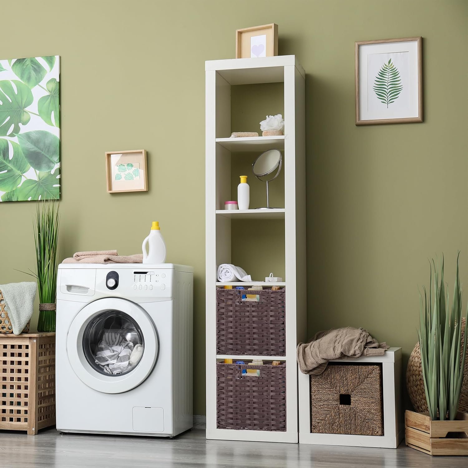 Благодарение на стандартната си кубична форма, кошниците пасват отлично в рафтове и шкафове в хола, спалнята или детската стая. Практичните дръжки улесняват преместването, а сгъваемата конструкция позволява лесно прибиране, когато не се използват. Материалът е пластмаса, която е устойчива и лесна за почистване чрез забърсване с влажна кърпа.