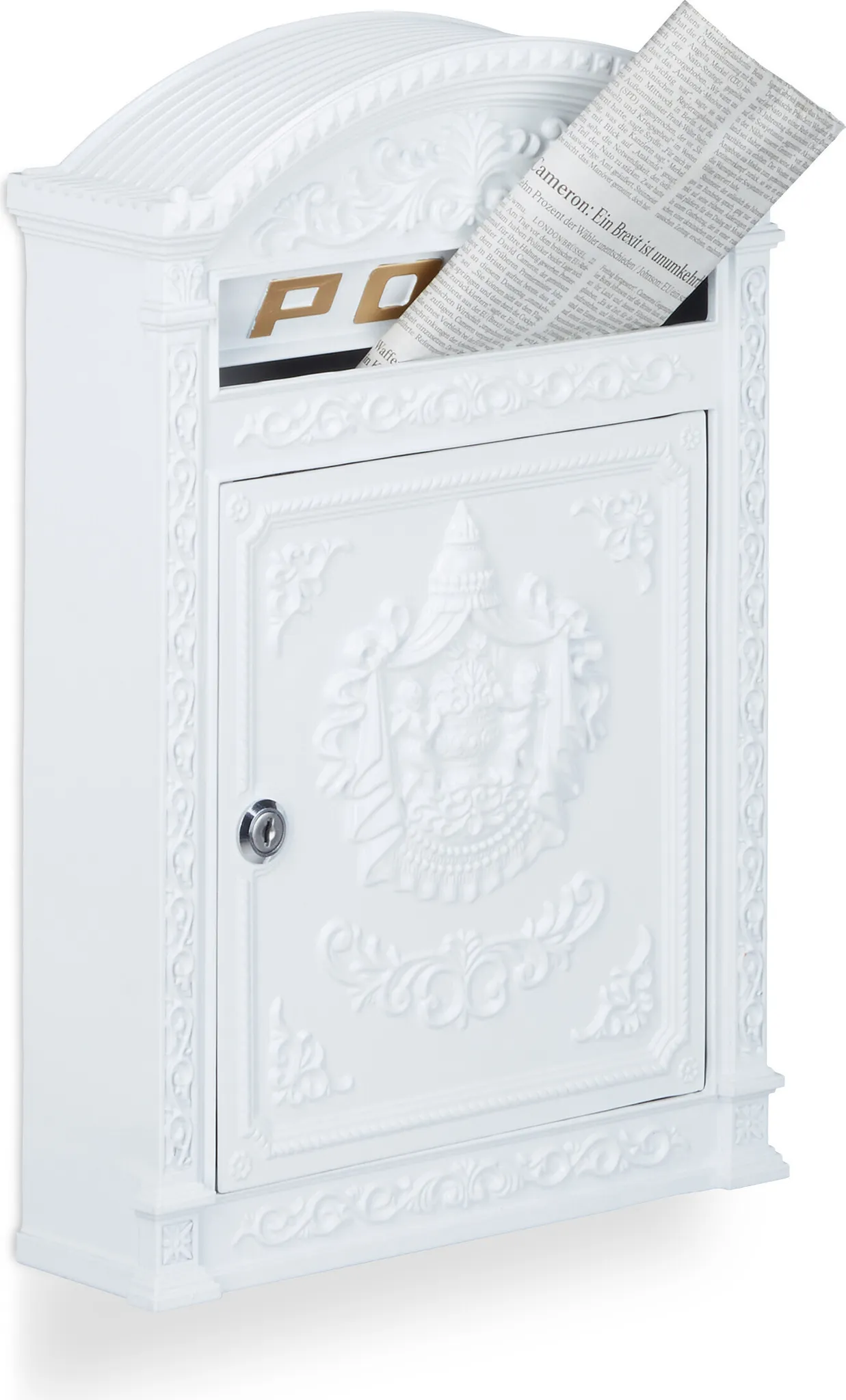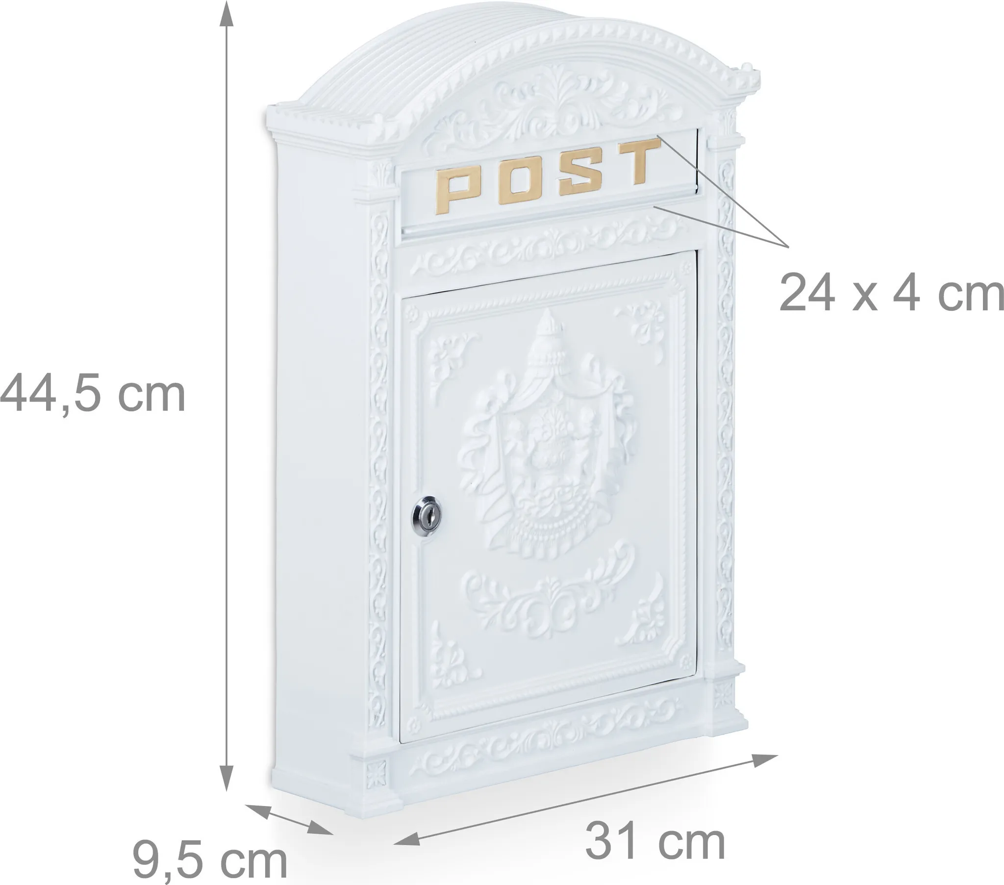 Тази пощенска кутия има античен вид с кръгъл покрив и декоративни детайли. Подходяща е за монтаж на фасада или ограда.