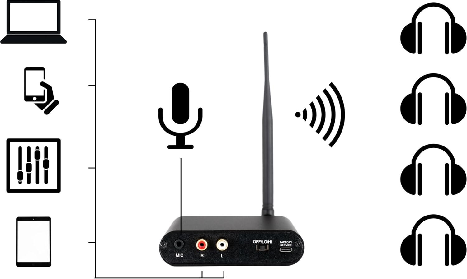 Безжичният стерео предавател предлага стабилно аудио предаване чрез UHF технология и е подходящ за музика, микрофони и различни аудио системи.