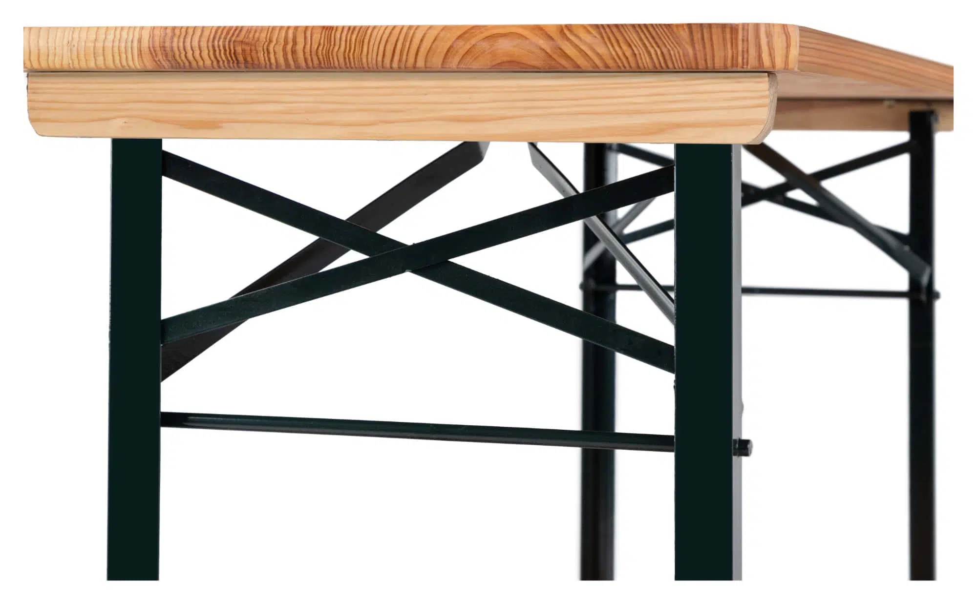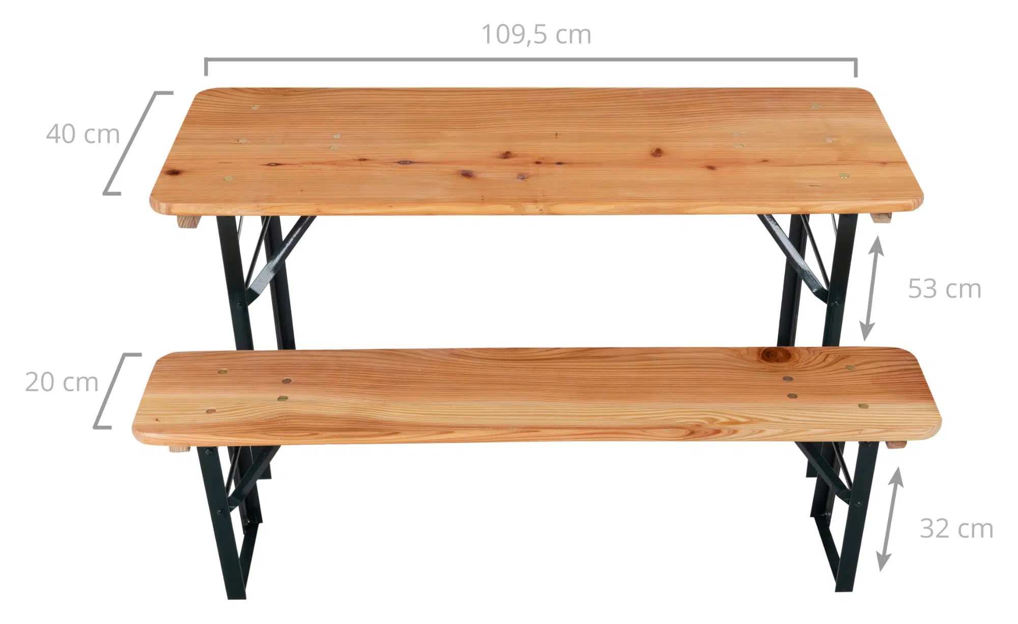 Комплектът е с по-ниска конструкция, което го прави подходящ за малки деца. Дървените повърхности са лакирани за по-добра защита, а здравата метална рамка позволява лесно сгъване за удобно съхранение и транспорт.