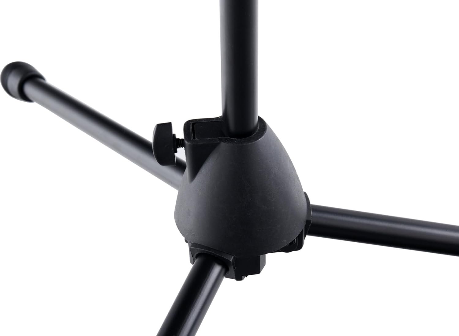 Здравата триножна конструкция осигурява сигурна опора, а гумените крачета предотвратяват приплъзване и намаляват шума при използване. Моделът разполага с регулируемо рамо, което може да се настройва по дължина и наклон, за да постигнете удобна позиция на микрофона. Благодарение на здравите скоби и металните вложки стойката остава стабилна дори при по-интензивна употреба.