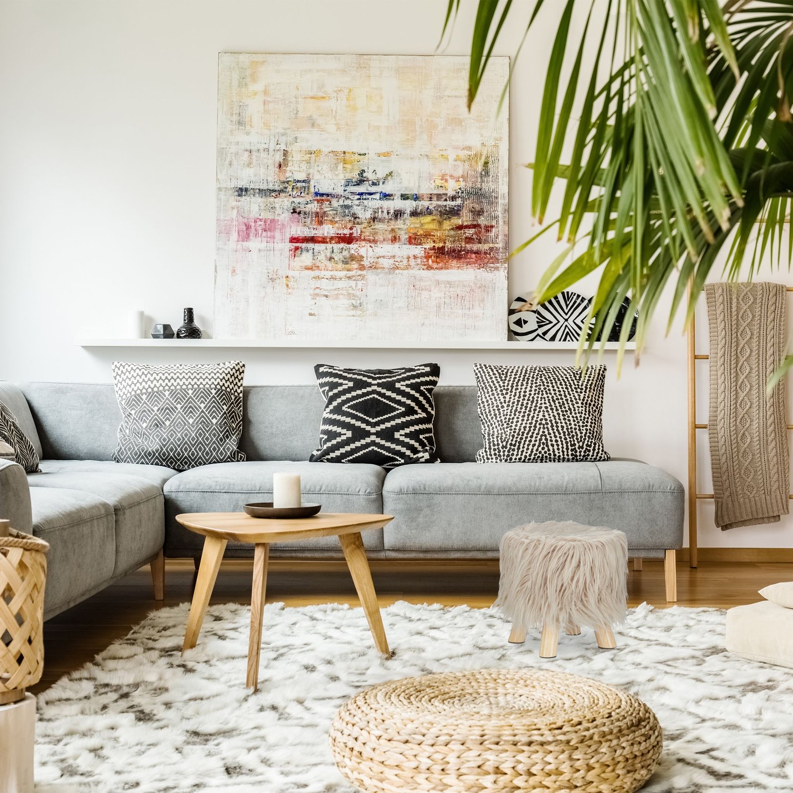 Тази кръгла табуретка с пухкава изкуствена кожа е декоративен акцент за всекидневна, спалня или детска стая.
