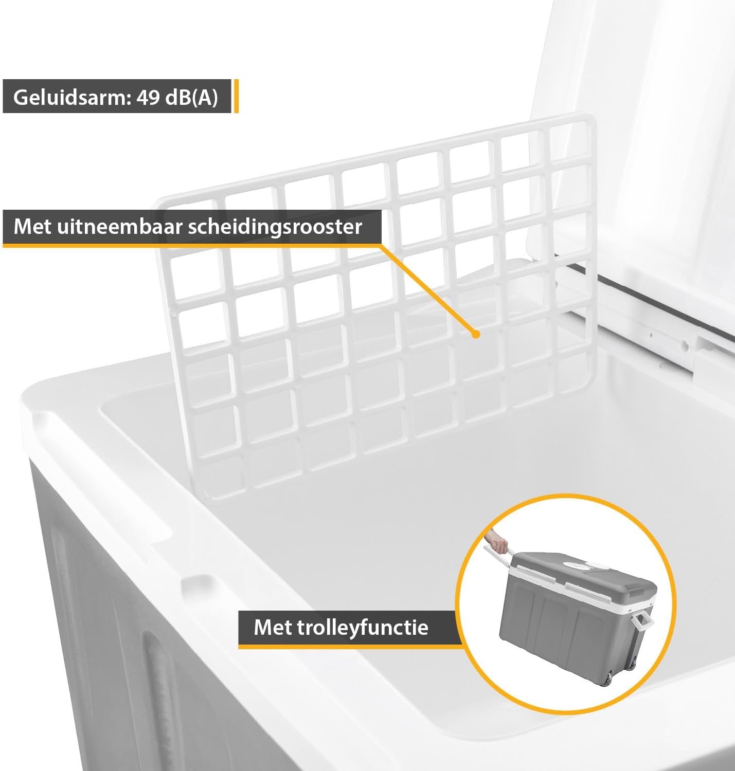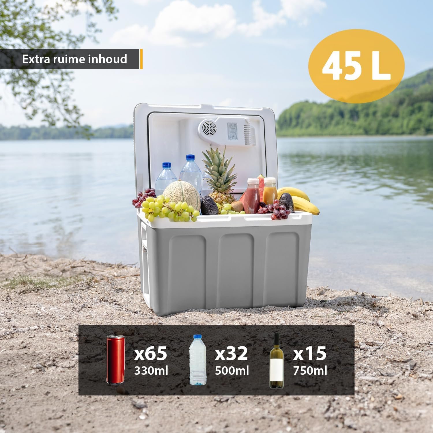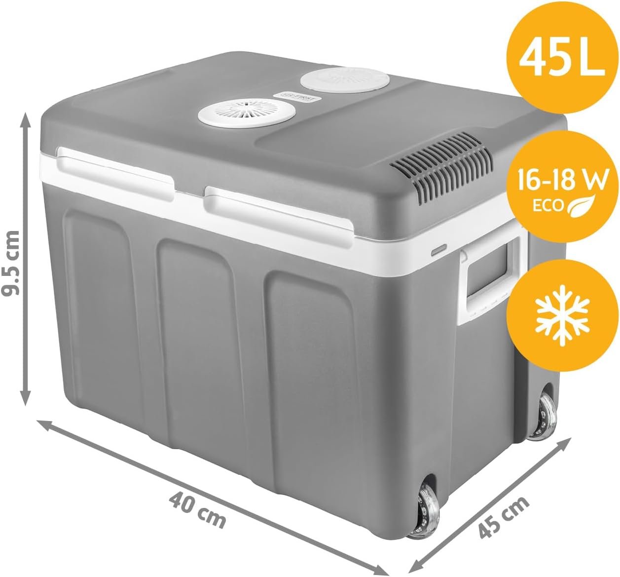 С вместимост от 45 литра, хладилната кутия предлага достатъчно място за семейни пътувания. Моделът разполага със стабилни гумени колела, телескопична дръжка и странични дръжки, които улесняват пренасянето. Вътрешните разделители помагат за организиране на напитки и хранителни продукти, а конструкцията позволява използване както хоризонтално, така и вертикално като мини хладилник.