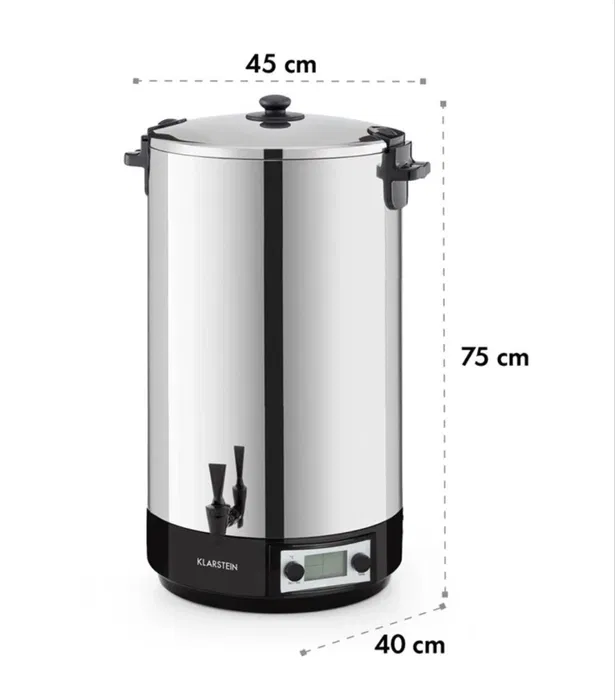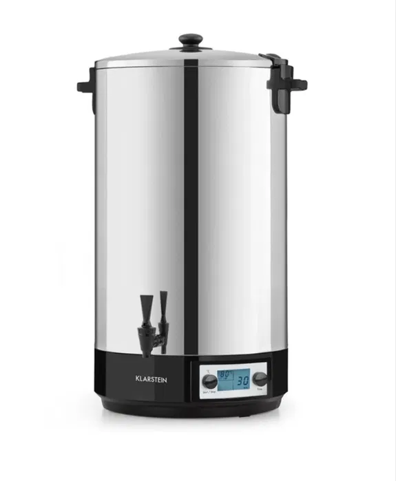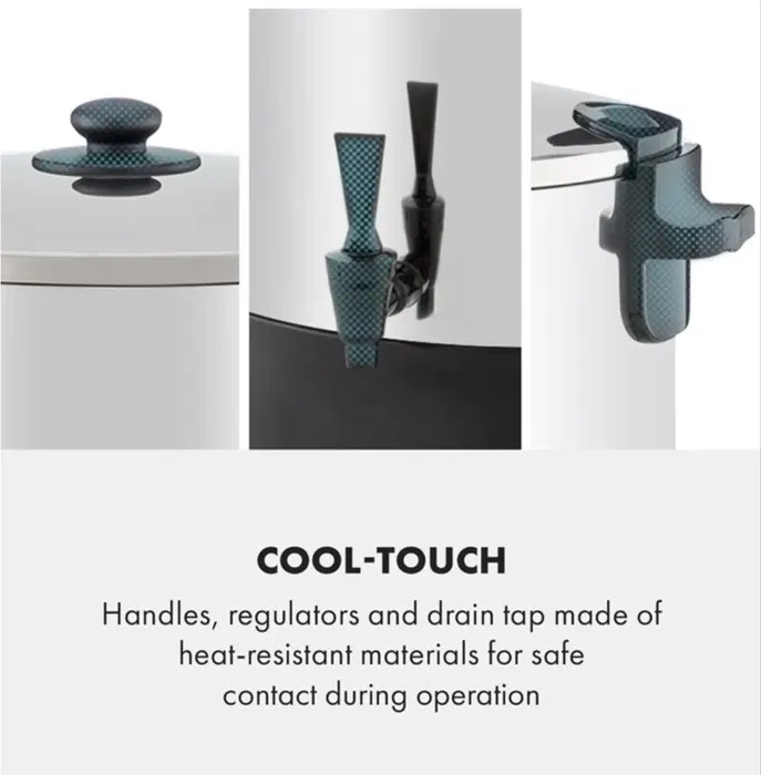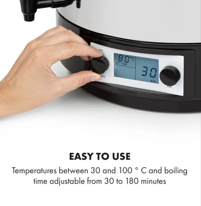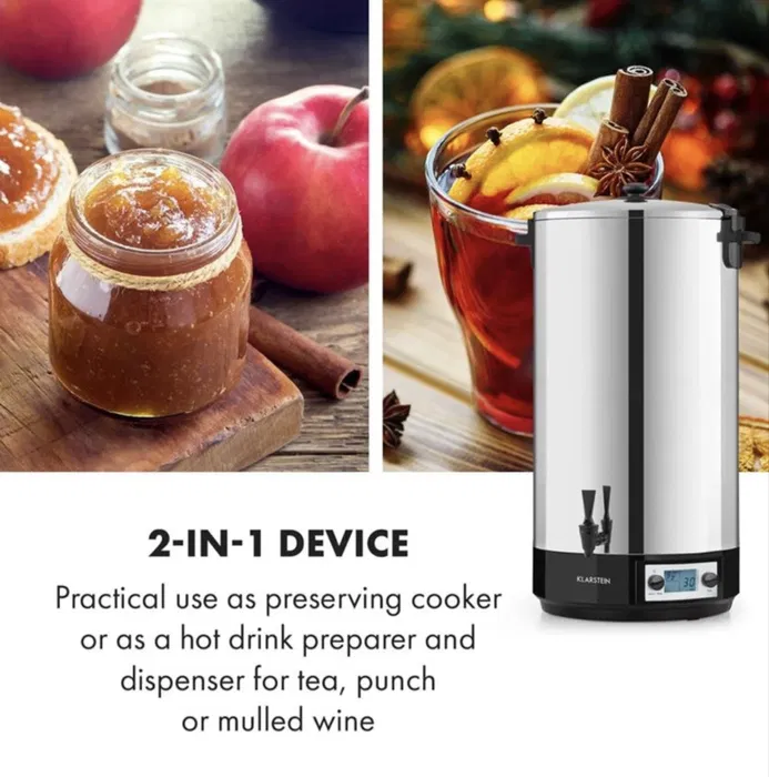 Но възможностите на Klarstein KonfiStar 60 все още не са изчерпани. Благодарение на изчистения си и хигиеничен интериор от неръждаема стомана, отводнителния кран Cool-Touch и интегрираната функция за задържане на топлината, той е идеално подходящ като дозатор за напитки като например горещ чай, пунч или греяно вино, като по този начин обогатява тържества, бюфети и конферентни зали.